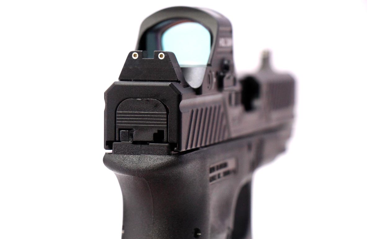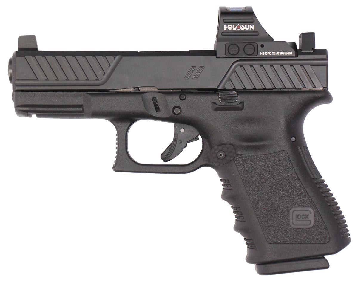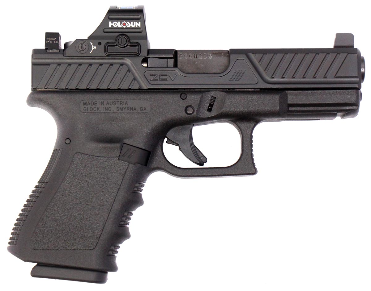 This is a used Custom Glock 19 Gen3 pistol chambered in 9mm. It features a 4.02-inch barrel, Zev slide, 10-round magazines, accessory rail, Zev extended magazine release button, Trijicon suppressor-height night sights, and Holosun 407C X2 red dot sight. Includes factory box, stripped OEM slide, and two 10-round magazines. Overall, this Glock is in good condition with normal use wear on the barrel and slide. This would be a good choice for personal protection. Buy online today!