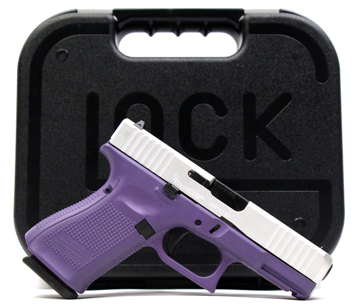 This is a used Glock 19 Gen5 pistol chambered in 9mm. It features a 4.02-inch barrel, 15-round magazines, accessory rail, purple Cerakote frame, nickel slide, and factory contrast sights. Includes factory box, two magazines, and instruction manual. Overall, this Glock is in good condition with normal use wear on the slide and barrel. This would be a good choice for personal protection. Buy online today!