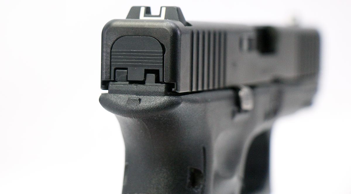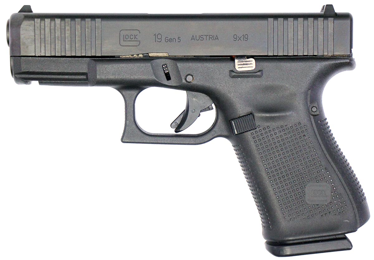 This is a used Glock 19 Gen5 pistol chambered in 9mm. It features a 4.02-inch barrel, 15-round magazines, accessory rail, and factory contrast sights. Includes factory box, magazine loading tool, three magazines, backstrap set, and instruction manual. Overall, this Glock is in good condition with normal use wear on the slide and barrel. This would be a good choice for personal protection. Buy online today!