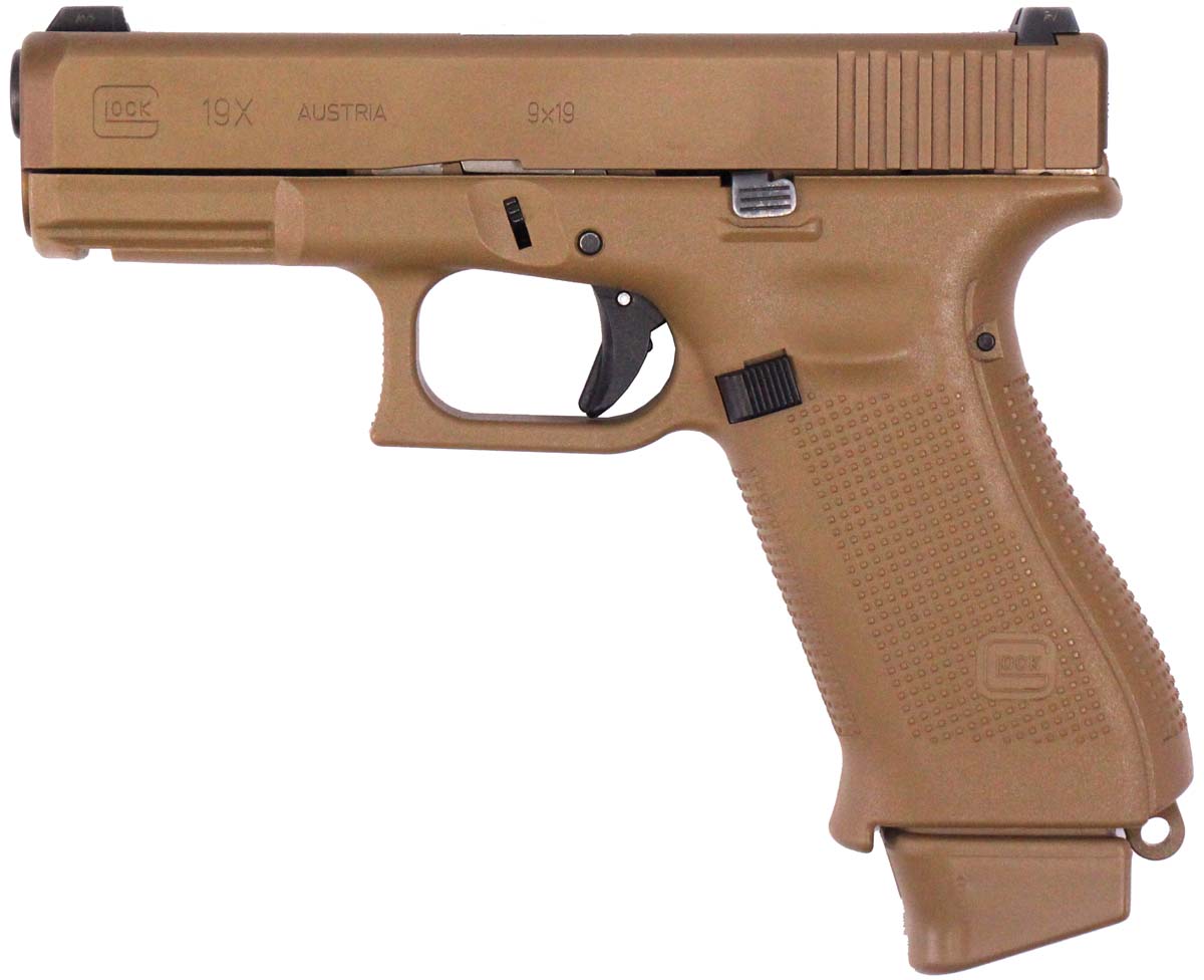 This is a used Glock 19X pistol chambered in 9mm. It features a 4.02-inch barrel, 19-round magazines, night sights, accessory rail, and flat dark earth finish. Includes factory box, instruction manual, one 17-round magazine, and two 19-round magazines. Overall, this Glock is in good condition with normal use wear on the barrel and slide. This would be a good choice for home defense. Buy online today!