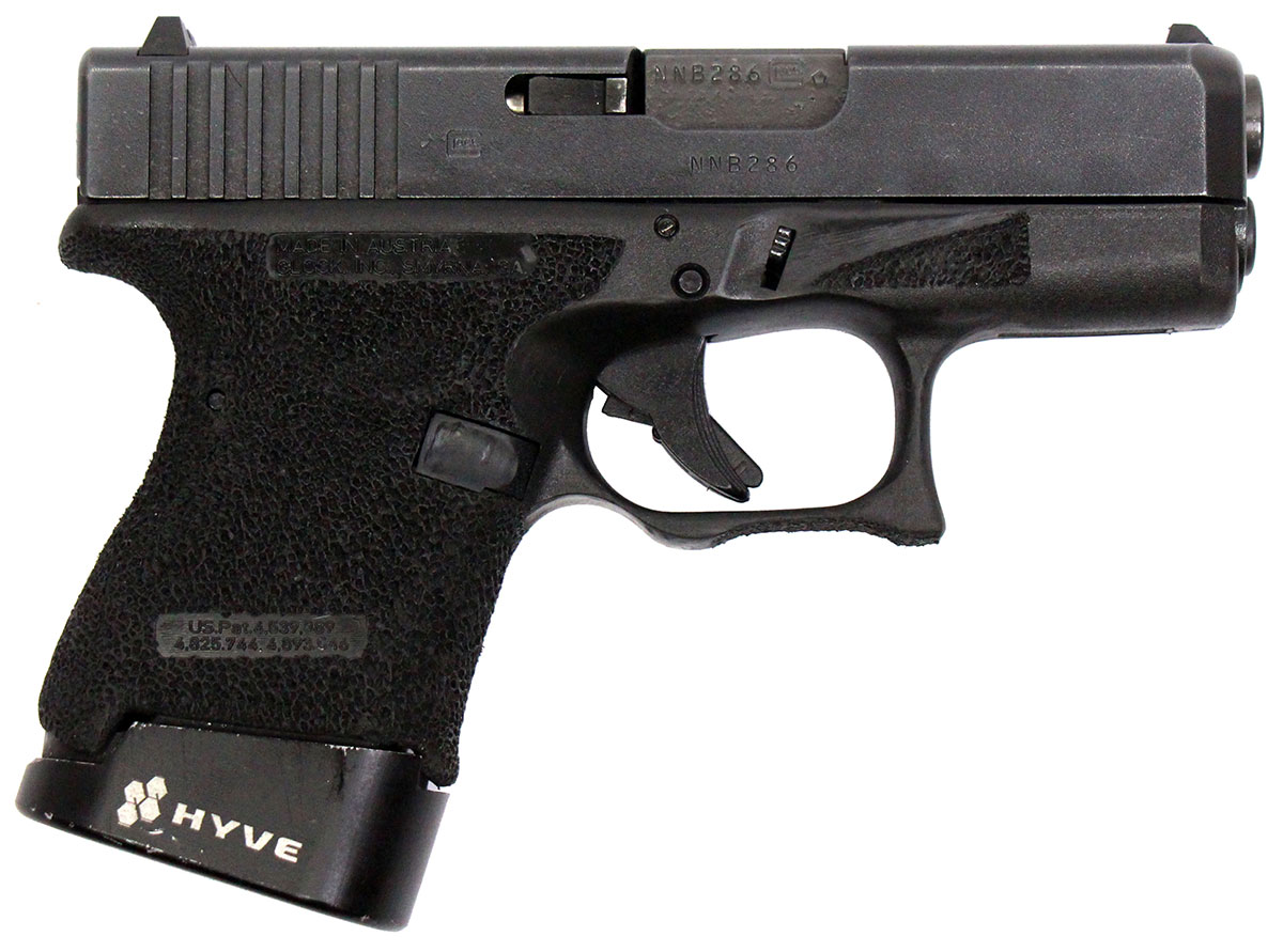 This is a used Glock 26 Gen3 pistol chambered in 9mm. It features a 3.46-inch barrel, 10-round magazine with Hyve +2 base pad, undercut trigger guard, stippled frame, and factory contrast sights. Overall, this Glock is in good condition with normal use wear on the barrel and slide. This would be a good choice for concealed carry. Buy online today!
