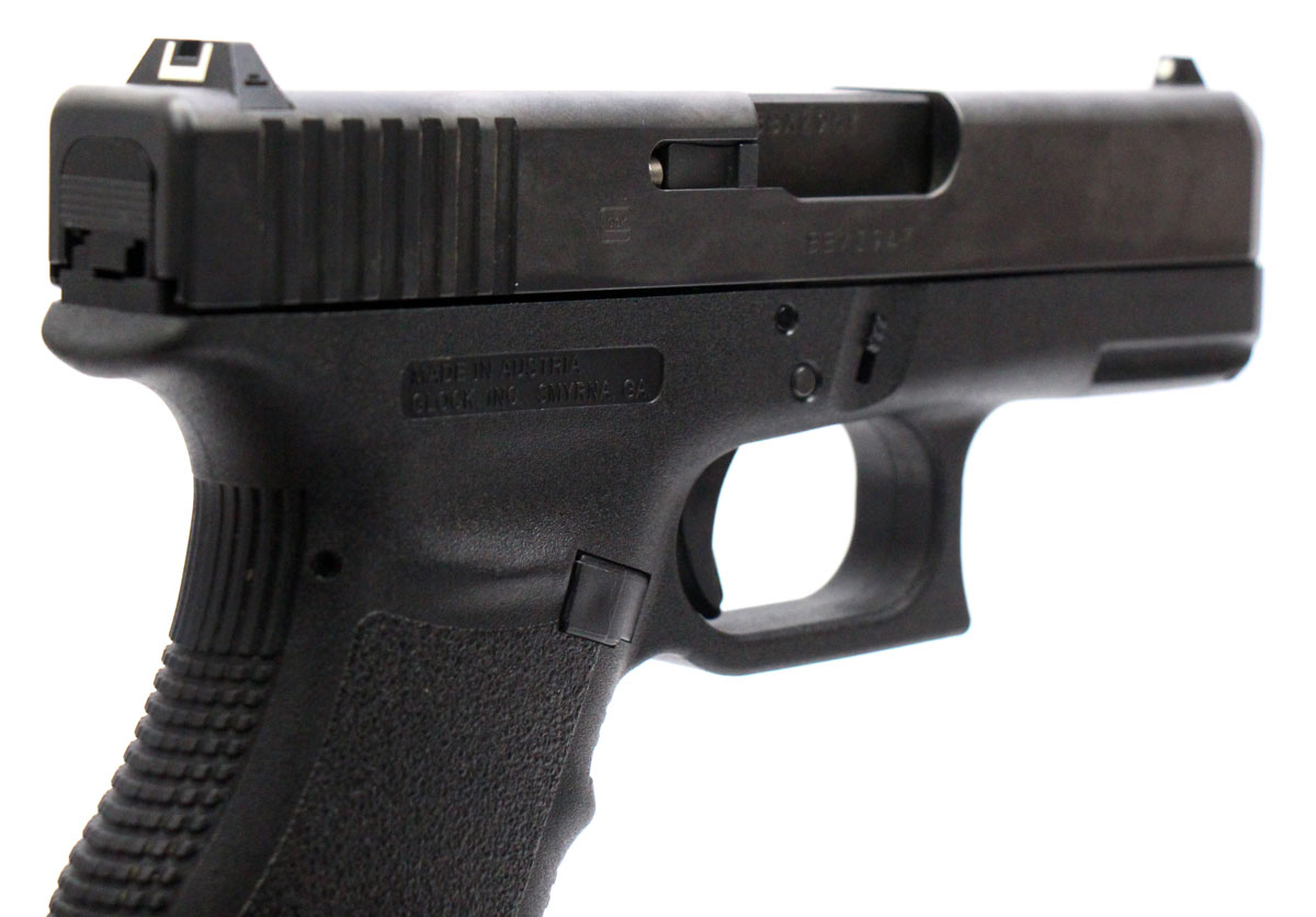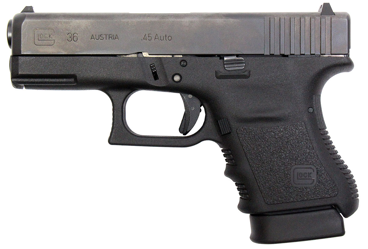 This is a used Glock 36 pistol chambered in 45 ACP. It features a 3.7-inch barrel, 6-round single stack magazines, and factory contrast sights. Includes factory box, manual, and two magazines. Overall, this Glock is in good condition with normal wear on the slide and barrel. This would be a good choice for concealed carry. Buy online today!