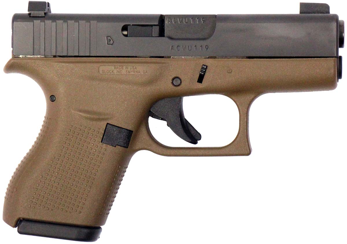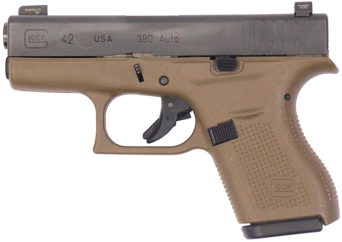 This is a used Glock 42 pistol chambered in 380 ACP. It features a 3.2-inch barrel, 6-round magazine, flat dark earth frame, and Ameriglo night sights. Overall, this Glock is in good condition with normal wear on the slide and barrel. This would be a good choice for concealed carry. Buy online today!