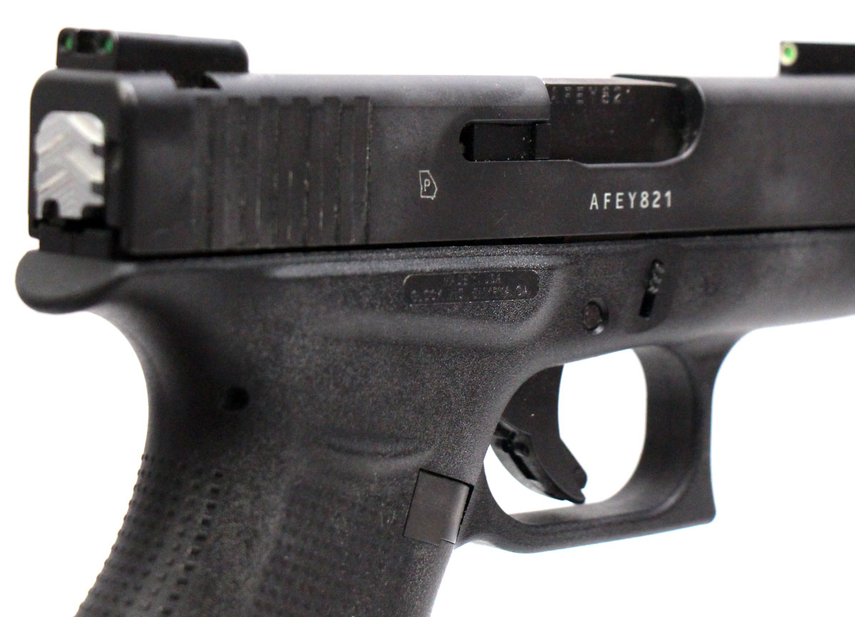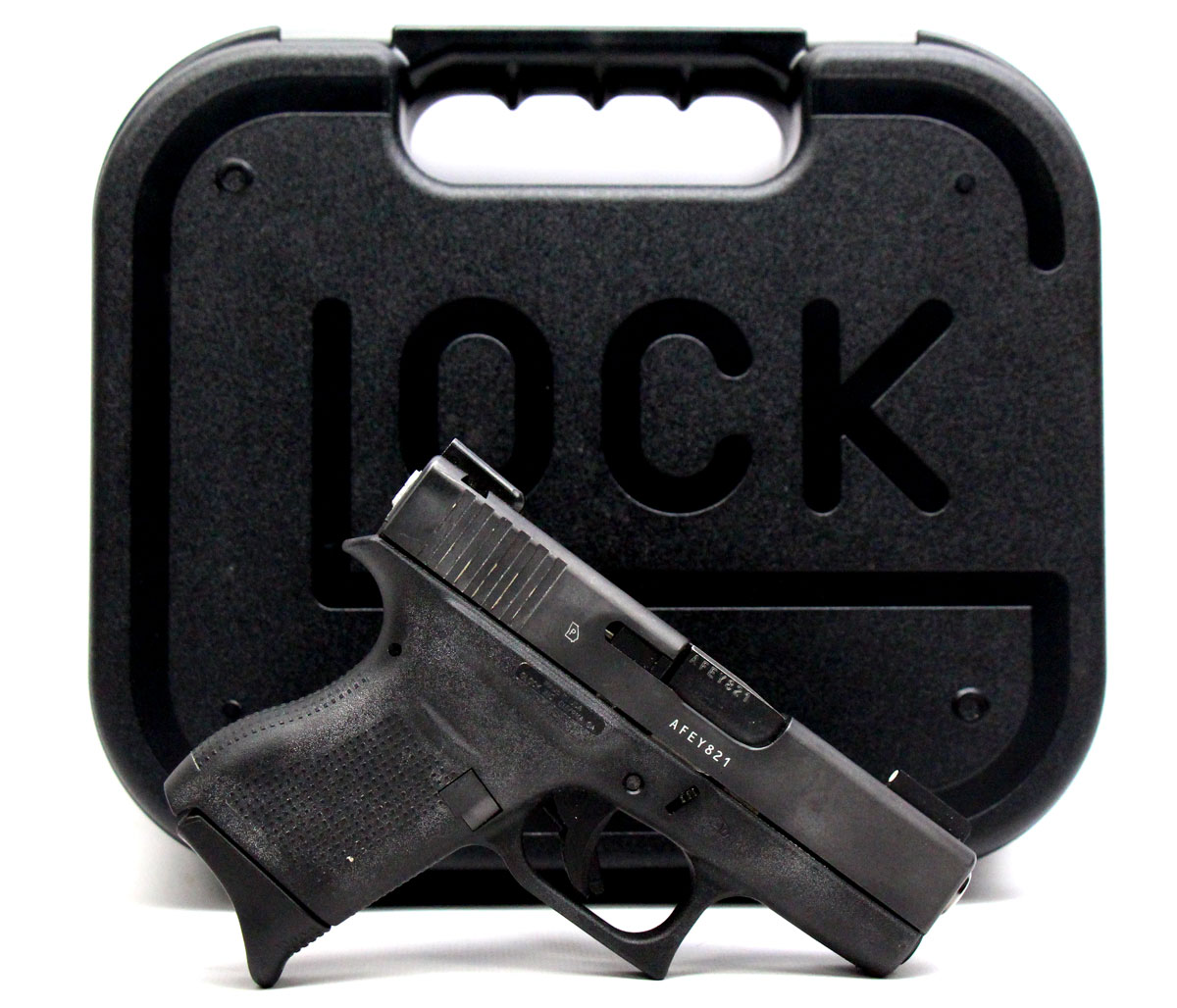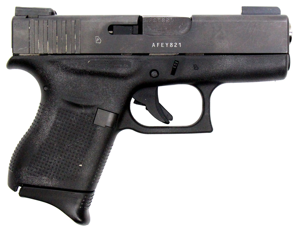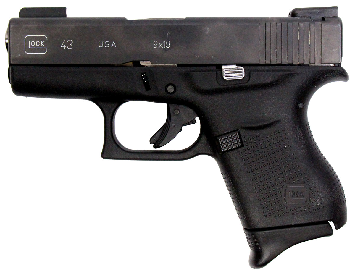 This is a used Glock 43 pistol chambered in 9mm. It features a 3.39-inch barrel with polygonal rifling, 6-round magazine, and green fiber optic sights. Includes factory box, instruction manual, and two magazines. Overall, this Glock is in good condition with normal use wear on the slide and barrel. This would be a good choice for concealed carry. Buy online today!