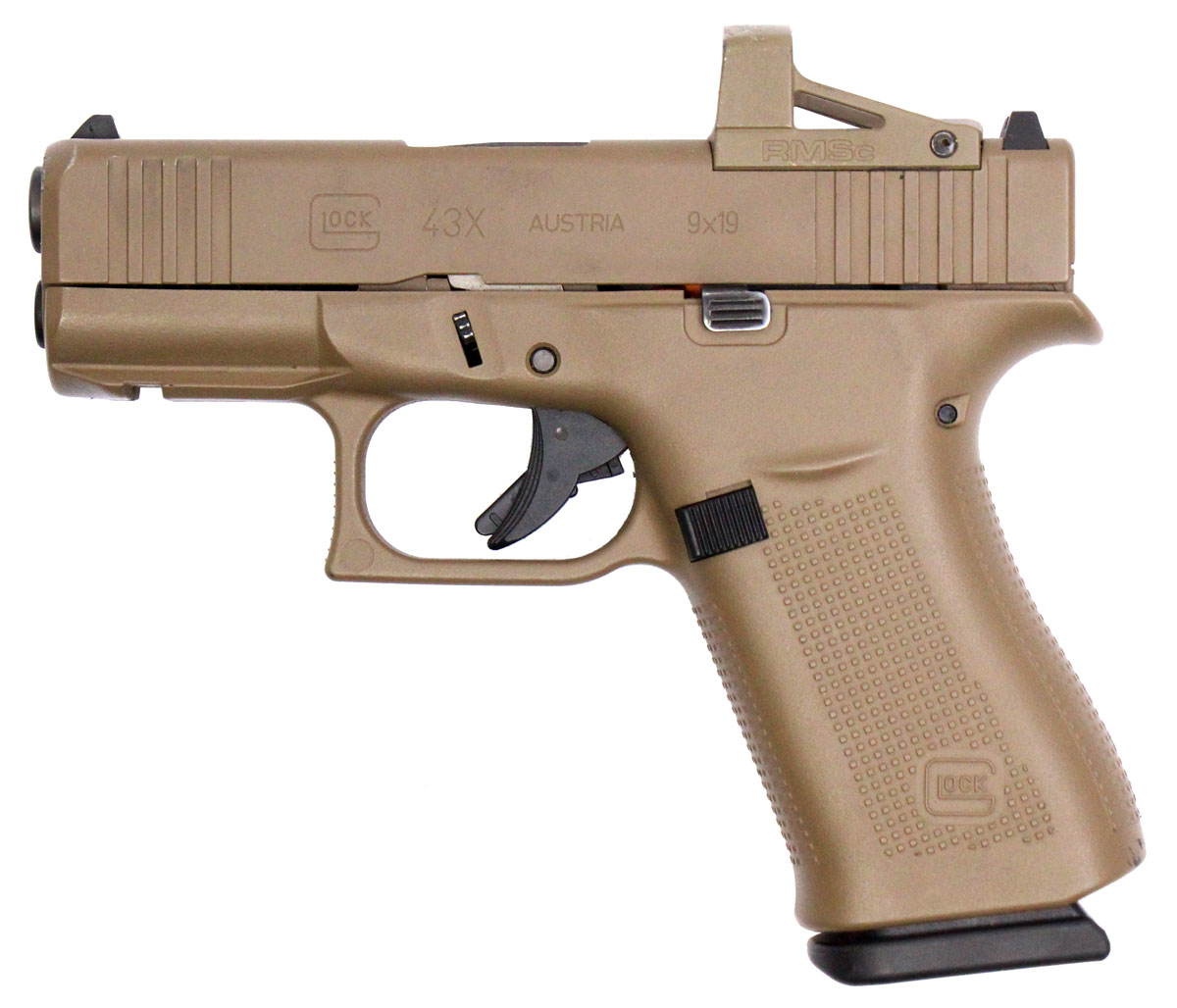 This is a used Glock 43X MOS pistol chambered in 9mm. It features a 3.41-inch barrel, 10-round magazine, factory contrast sights, Shield RSMC red dot sight, flat dark earth finish, and front slide serrations. Overall, this Glock is in good condition with normal wear on the barrel and slide. This would be a good choice for concealed carry. Buy online today!