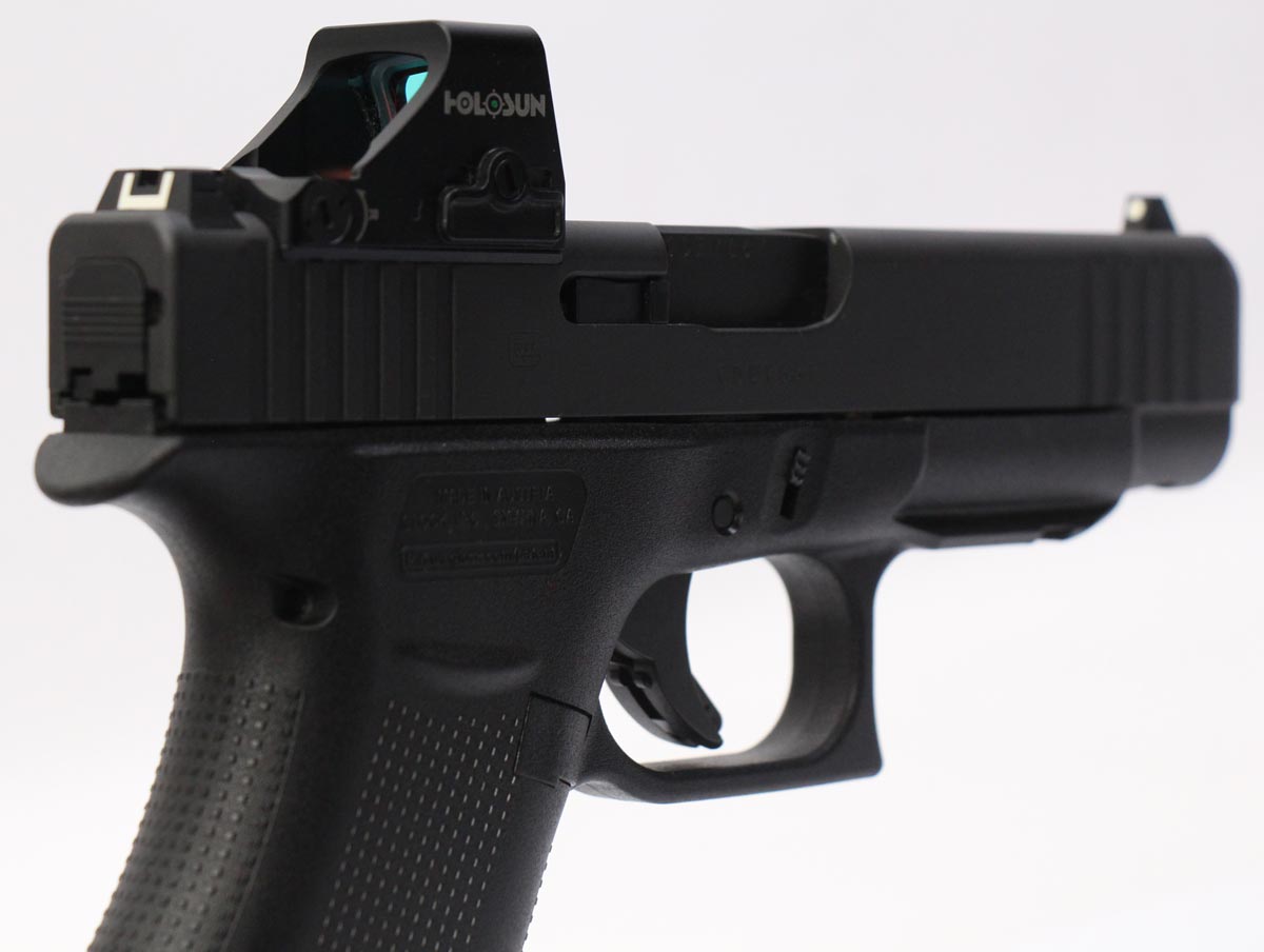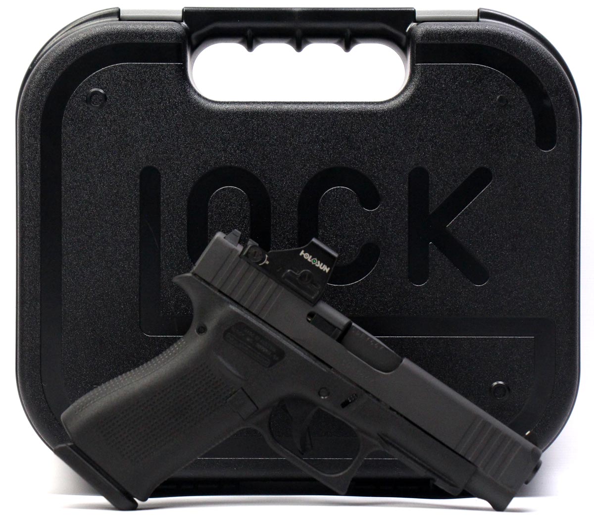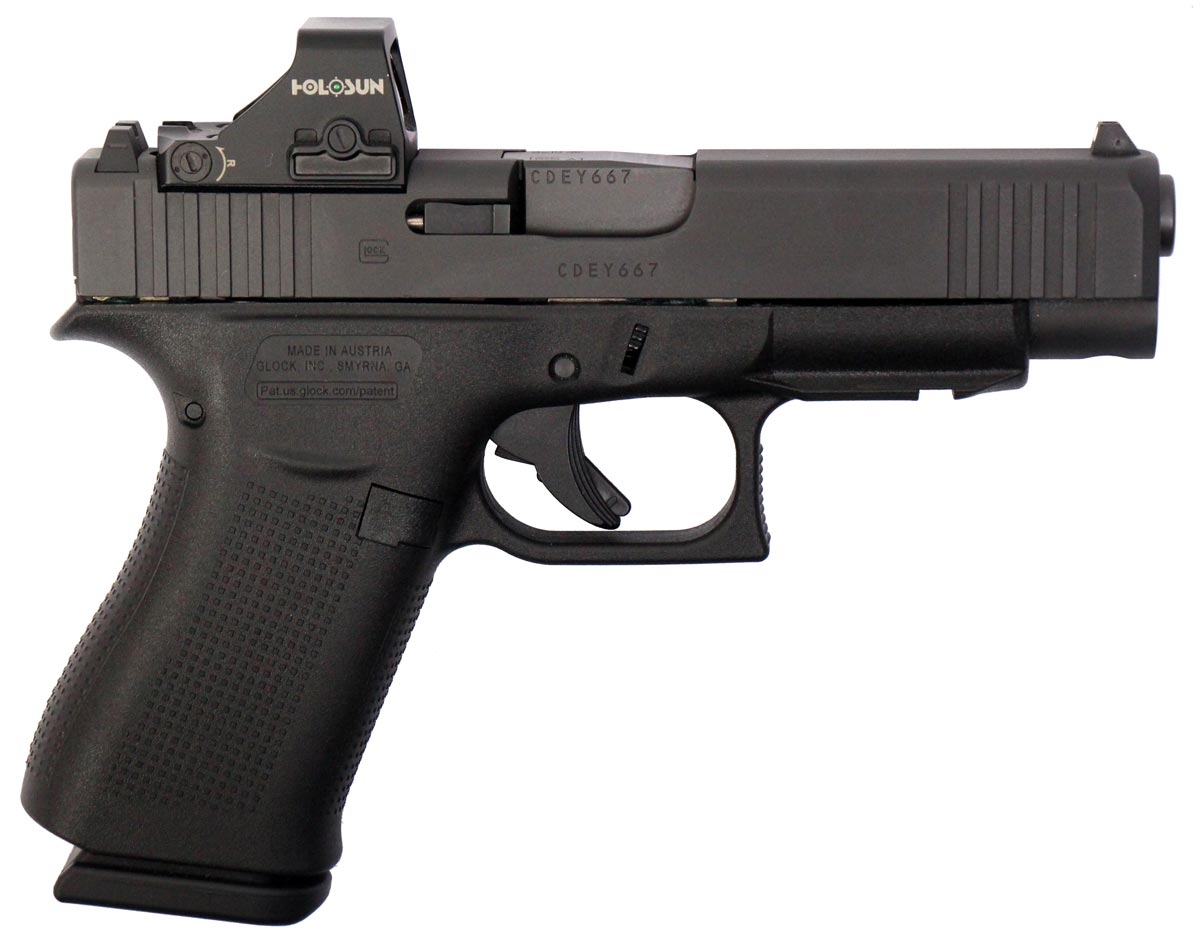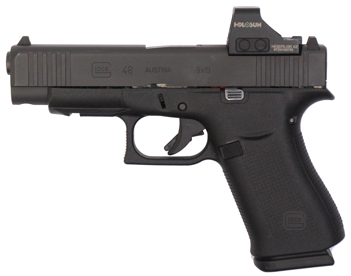 This is a used Glock 48 pistol chambered in 9mm. It features a 4.17-inch barrel, 10-round magazines, accessory rail, and Holosun HS507K green dot sight. Includes factory box, manual, magazine loading tool, and two magazines. Overall, this Glock is in good condition with normal wear on the slide and barrel. This would be a good choice for concealed carry. Buy online today!