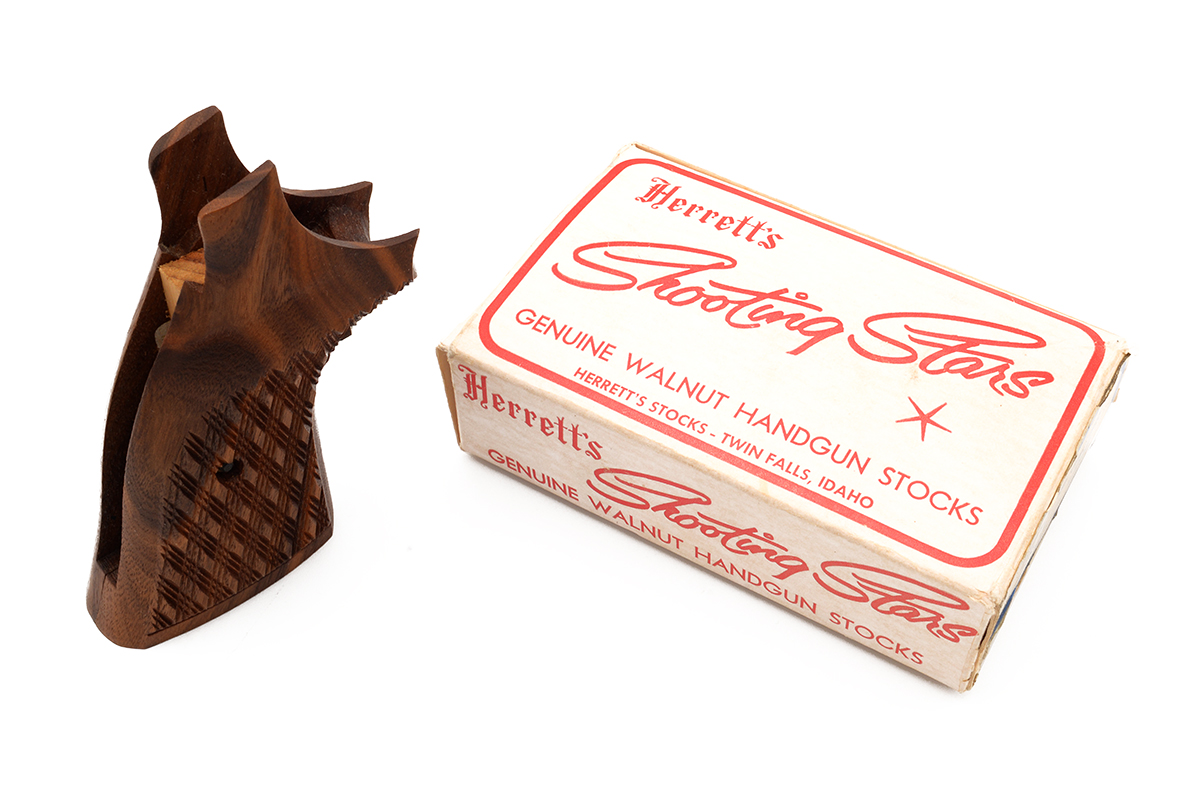 This is a set of vintage Harrett's Shooting Star Genuine Walnut Handgun Stocks, model RM. They feature wood construction with diamond checkering and will fit S&W N frame revolvers with square butt. Overall condition is very good, they don't appear to have ever been used, the box has some wear, stains and soft edges. Buy online today!
