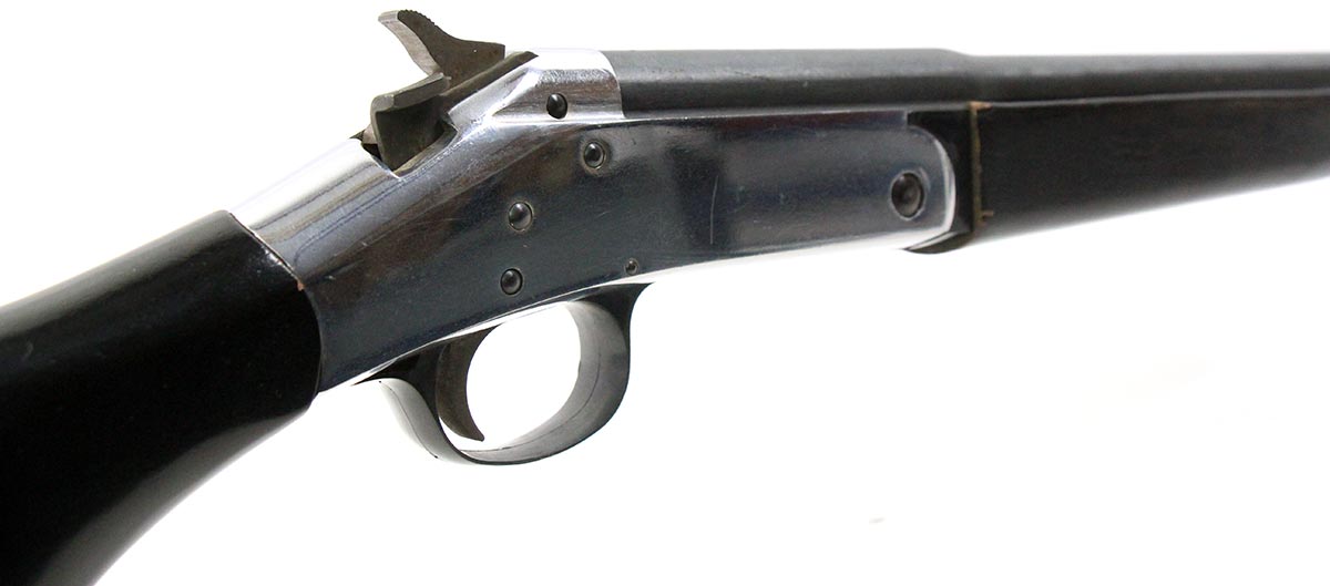 This is a used Harrington & Richardson Deluxe Topper Jr. 590A shotgun chambered in 410 bore. It features a 26-inch barrel, 3-inch chamber, 12.25-inch length of pull, fixed full choke, black-painted wood furniture, and nickel plated receiver. Overall, this shotgun is in good condition with some handling wear on the stock and barrel. This would be a good choice for small game hunting. Buy online today!