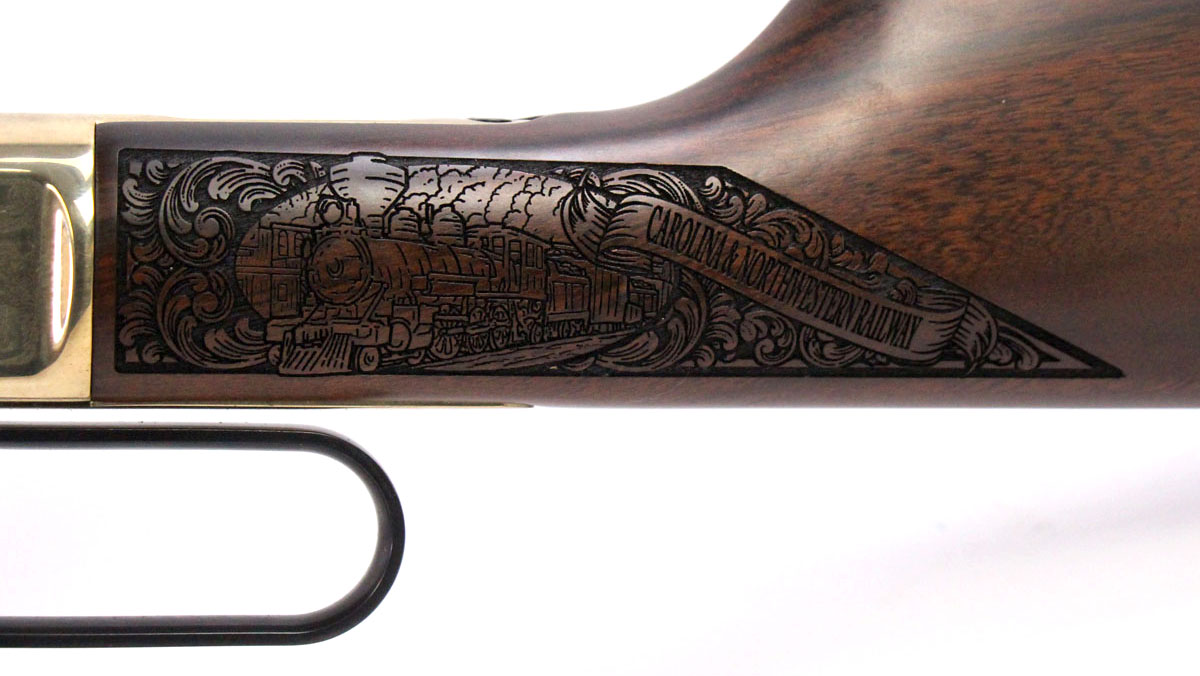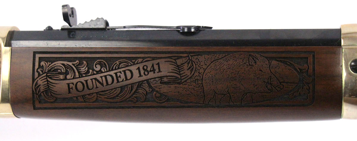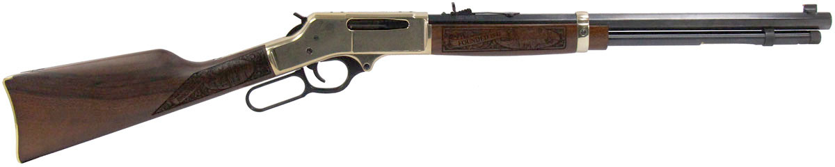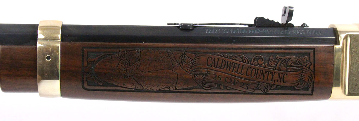This is a used Henry Brass Lever Action Caldwell County, NC commemorative rifle chambered in 30-30 Winchester. It features a 20-inch octagon barrel, 5-round magazine tube, semi buckhorn rear sight, brass bead front sight, engraved receiver, and carved walnut stock. Includes factory box and manual. Overall, this rifle is in very good condition with minimal wear. Bore condition is good with crisp rifling. This would be a great choice for collecting. Buy online today!