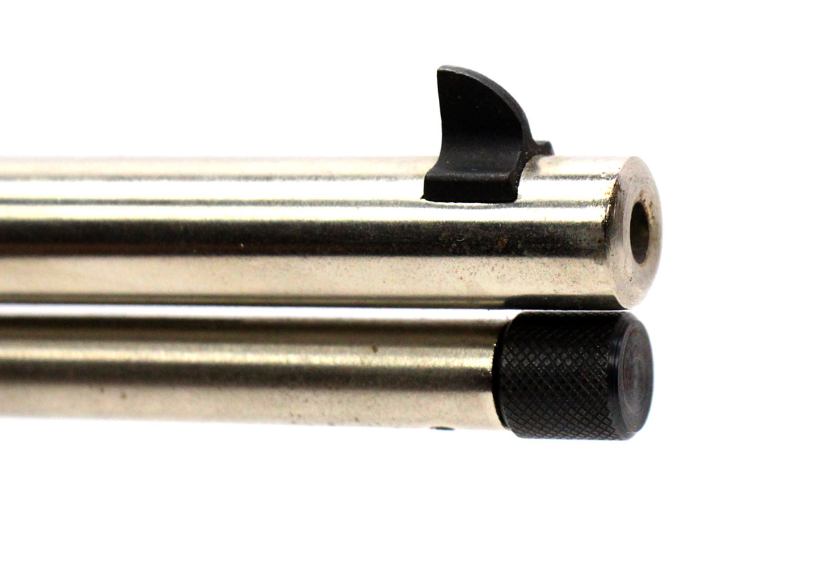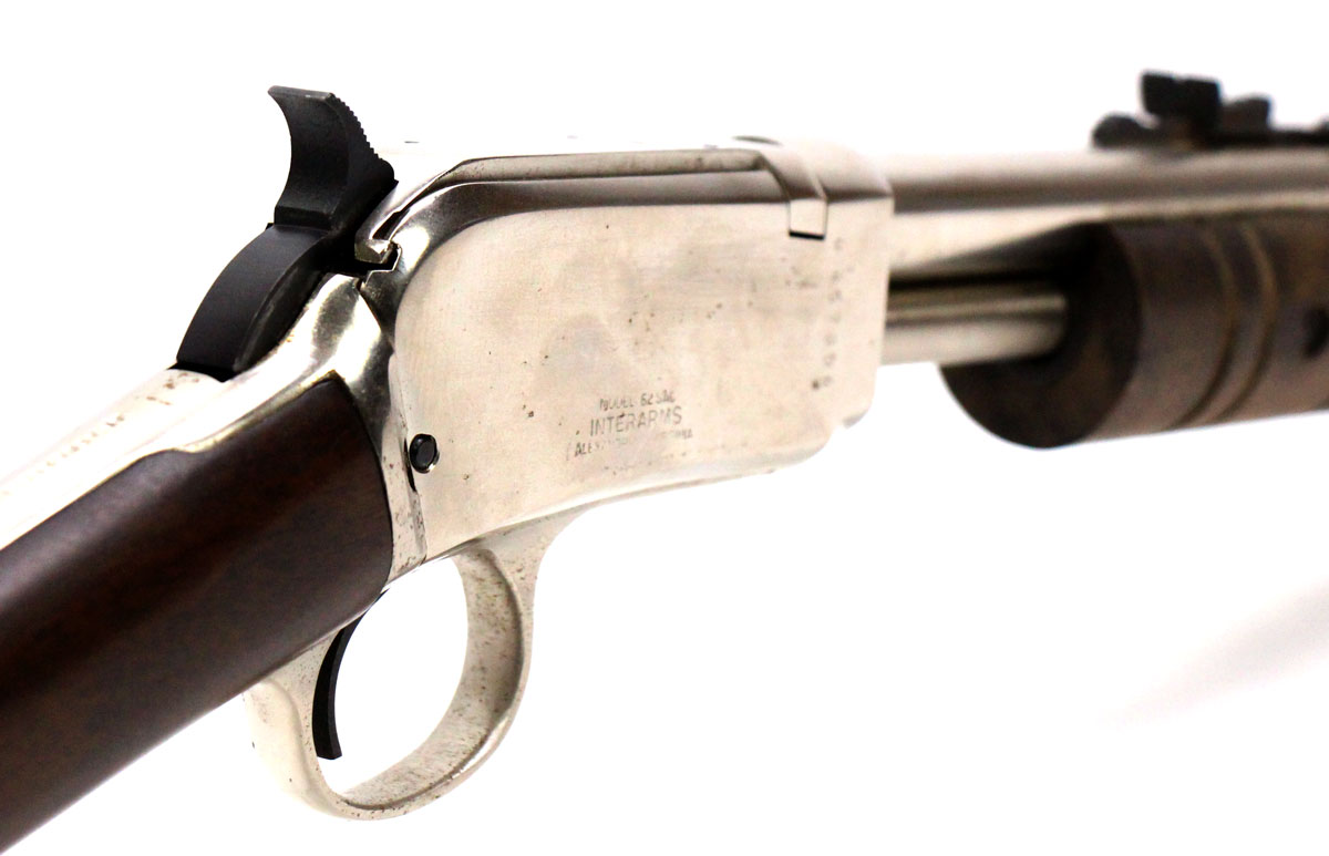 This is a used Interarms Rossi 62 SAC rifle chambered in 22 Long Rifle. It features a 16.5-inch barrel, 12-round capacity, bright nickel finish, and wood furniture. Overall, this rifle is in good condition with some handling wear on the stock and receiver. The rear sight shows some surface corrosion. Bore condition is good with crisp rifling. This would be a good choice for recreational target shooting. Buy online today!