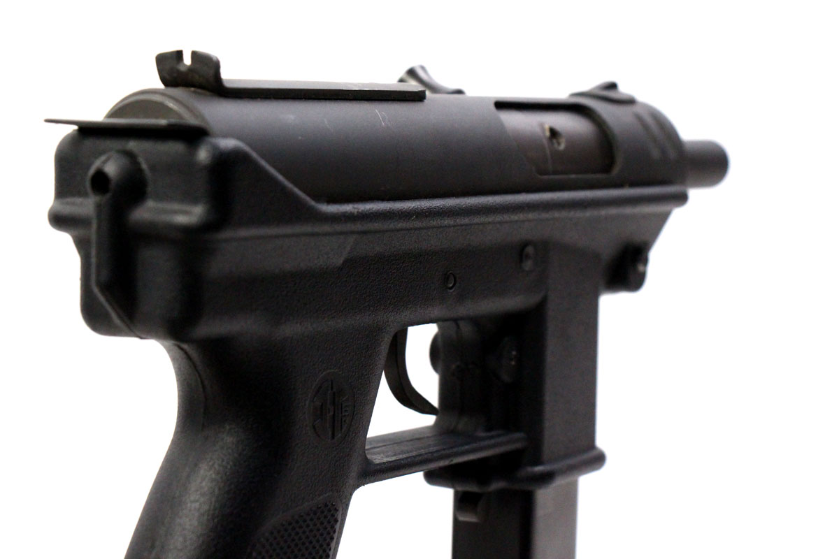 This a used Intratec AB-10 pistol chambered in 9mm. It features a 3-inch barrel, 32-round magazine, fixed sights, and polymer frame. Includes factory box, one 10-round magazine, one 32-round magazine, and instruction manual. Overall, this Intratec is in good condition with some handling on the upper receiver. This would be a good choice for recreational target shooting. Buy online today!