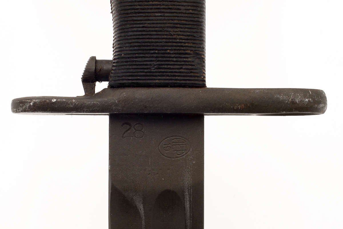 This is an Italian made M1 bayonet for the M1 Garand or BM59 rifle. It features a 9.5" blade, overall length of 14.25", it is marked "AEP 28" on one side of the ricasso and serial numbered on the other side. Overall condition of the bayonet is good with the original edge, there is some light wear to the finish and rust in a few spots. The scabbard is in similar condition to the bayonet with some patina and wear. Buy online today!