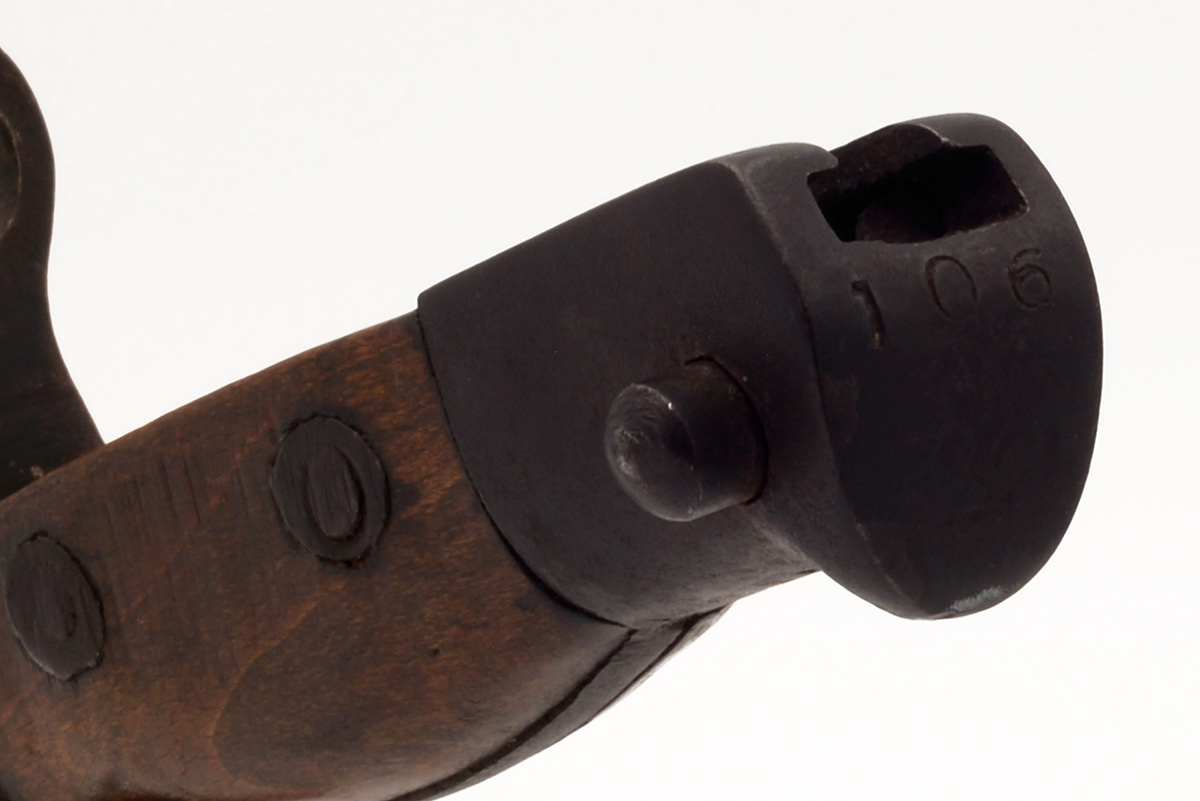 This is a vintage WW2 Japanese Type 30 "School" or "Trainer" bayonet. It features a 15" dull blade with an overall length of 19.5", it has a hooked quillon, wood handle and is numbered "106" on the pommel. Overall condition is good, the wood grips are in nice shape. There is some tarnishing and nicks to the blade, the guard, handle and pommel have a fair bit of patina. The scabbard is in fair shape with some dents, patina and surface rust. Please note that this bayonet will not mount on a service rifle, due to the smaller muzzle ring. Buy online today!