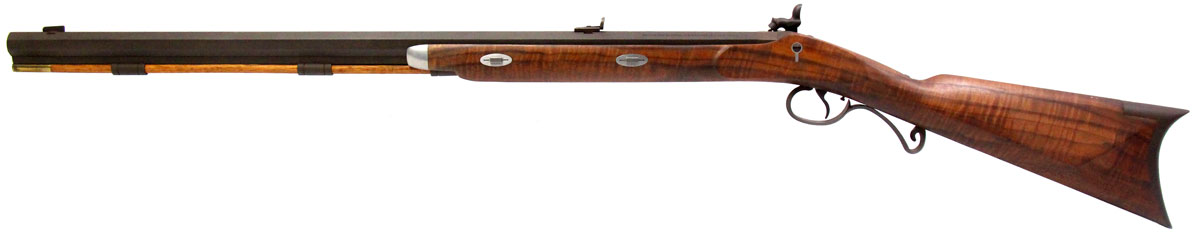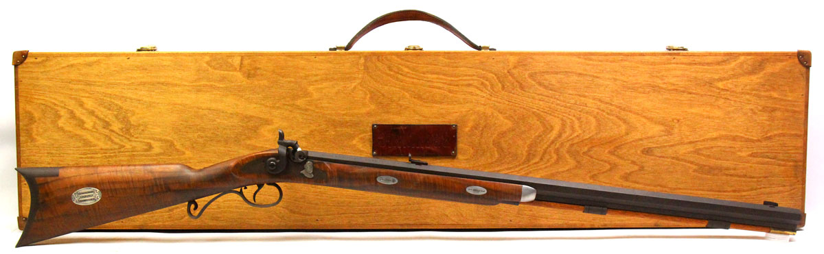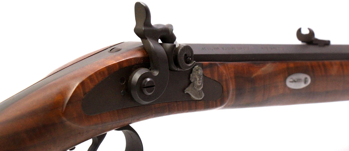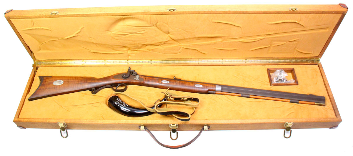 This is a used Centennial Commemorative Jonathan Browning Mountain Muzzle-Loading Rifle chambered for 50 caliber projectiles. It features a 30-inch octagon barrel, brown finish, percussion ignition system, buckhorn rear sight, wooden ramrod, and brass patch box. Includes factory case and powder horn. Overall, this rifle is in good condition with some handling wear on the stock. Bore condition is good with crisp rifling. This would be a good choice for collectors or for hunting. Buy online today!