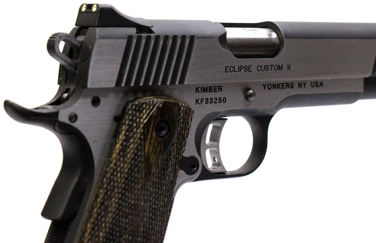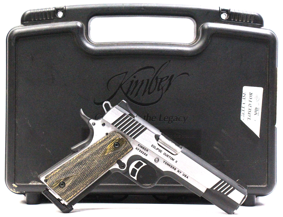This is a used Kimber Custom Eclipse II pistol chambered in 10mm. It features a 5-inch barrel, 8-round magazines, night sights, thumb safety, grip safety, wood grips, and stainless finish with black accents. Includes factory box, manual, and two magazines. Overall, this pistol is in good condition with normal use wear on the slide, barrel, and frame. This would be a good choice for target shooting. Buy online today!