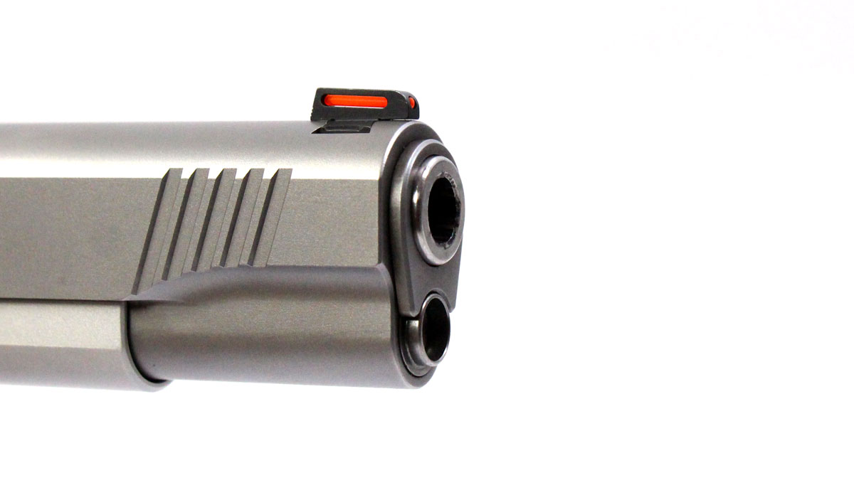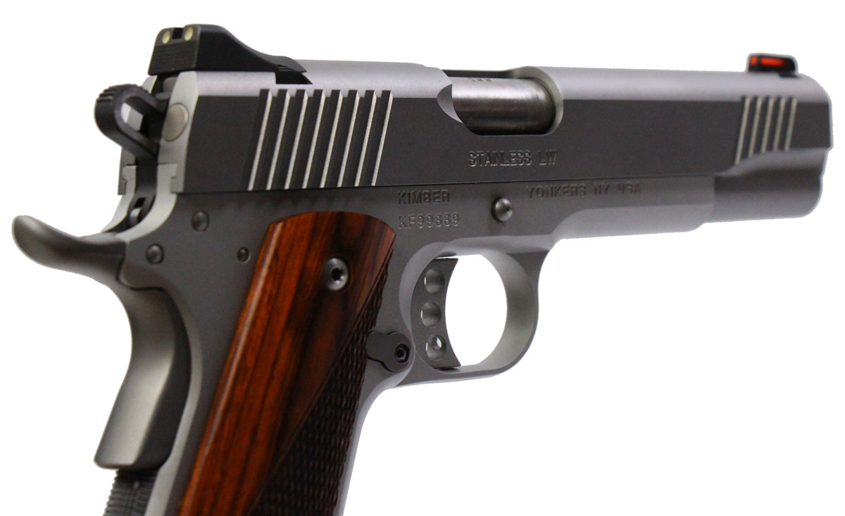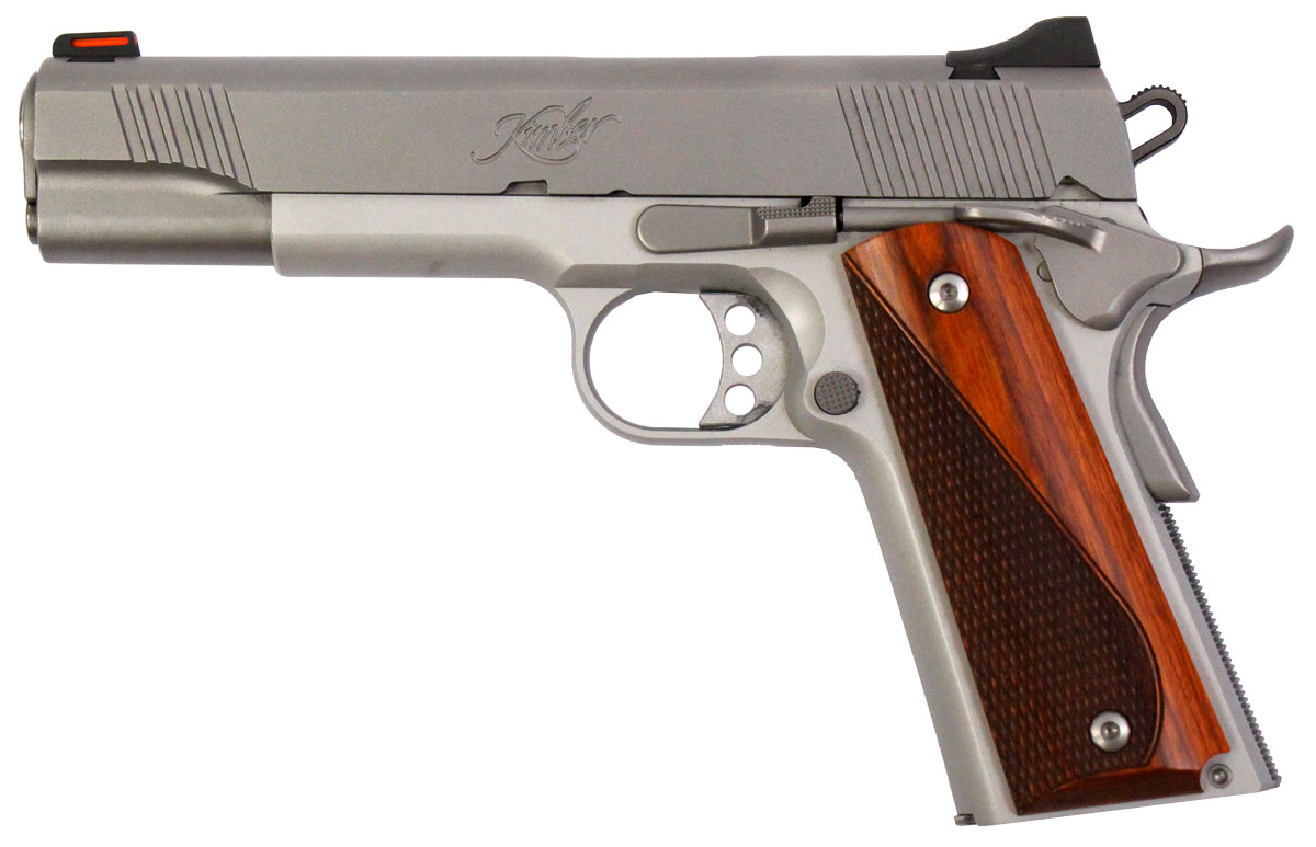 This is a used Kimber 1911 Stainless LW pistol chambered in 9mm. It features a 5-inch barrel, 8-round magazine, thumb safety, grip safety, fiber optic front sight, wood grips, and alloy frame. Includes factory box, manual, bushing wrench, and two magazines. Overall, this pistol is in good condition with normal use wear on the slide and barrel. This would be a good choice for target shooting. Buy online today!