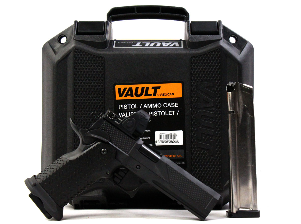 This is a used Legion Precision Chiraq Government pistol chambered in 9mm. It features a 5-inch ported barrel, 18-round magazine, ambidextrous thumb safety, accessory rail, flared magwell, steel frame, and Trijicon SRO red dot sight. Includes Pelican Vault case, one 18-round magazine, and one 29-round magazine. Overall, this pistol is in very good condition with minimal wear. This would be a great choice for target shooting. Buy online today!