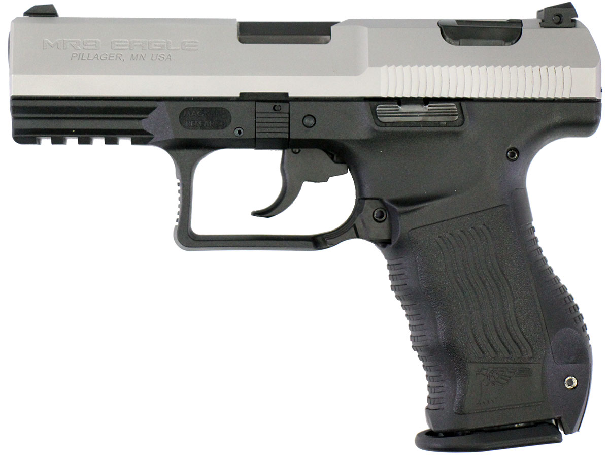 This is a used Magnum Research MR9 pistol chambered in 9mm. It features a 4-inch barrel, 15-round magazine, stainless slide, accessory rail, double/single action, and paddle magazine release. Includes factory box, instruction manual, backstrap set, and two magazines. Overall, this MR9 is in good condition with normal use wear on the slide and barrel. This would be a good choice for home defense. Buy online today!