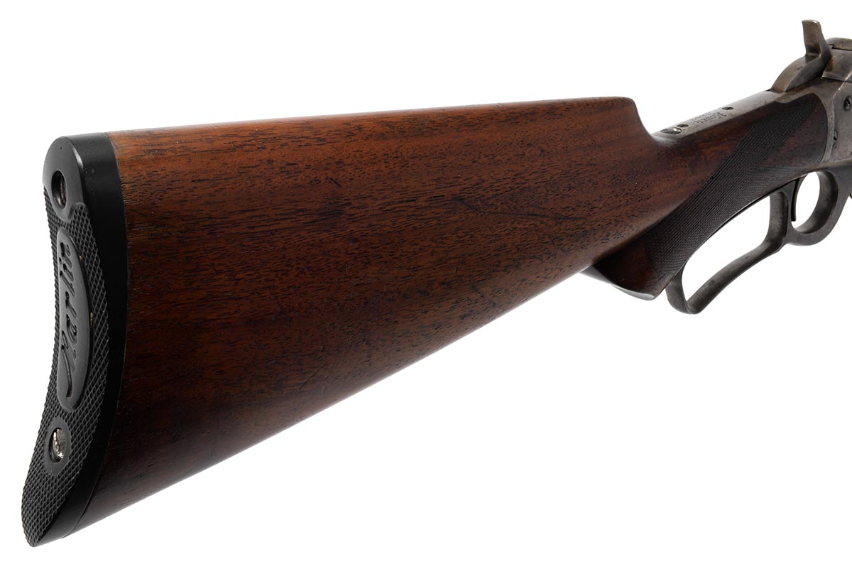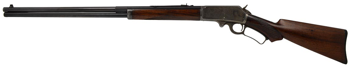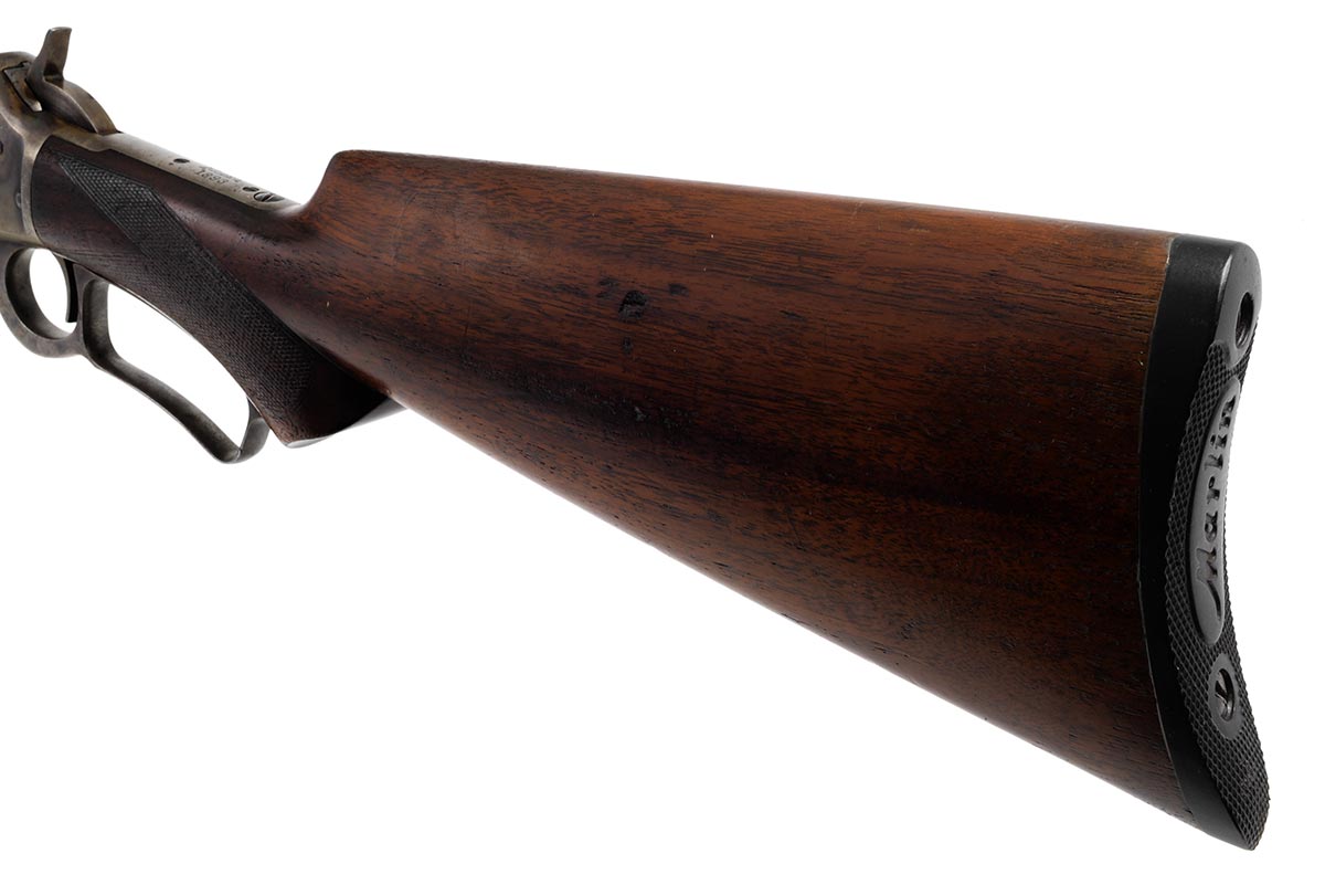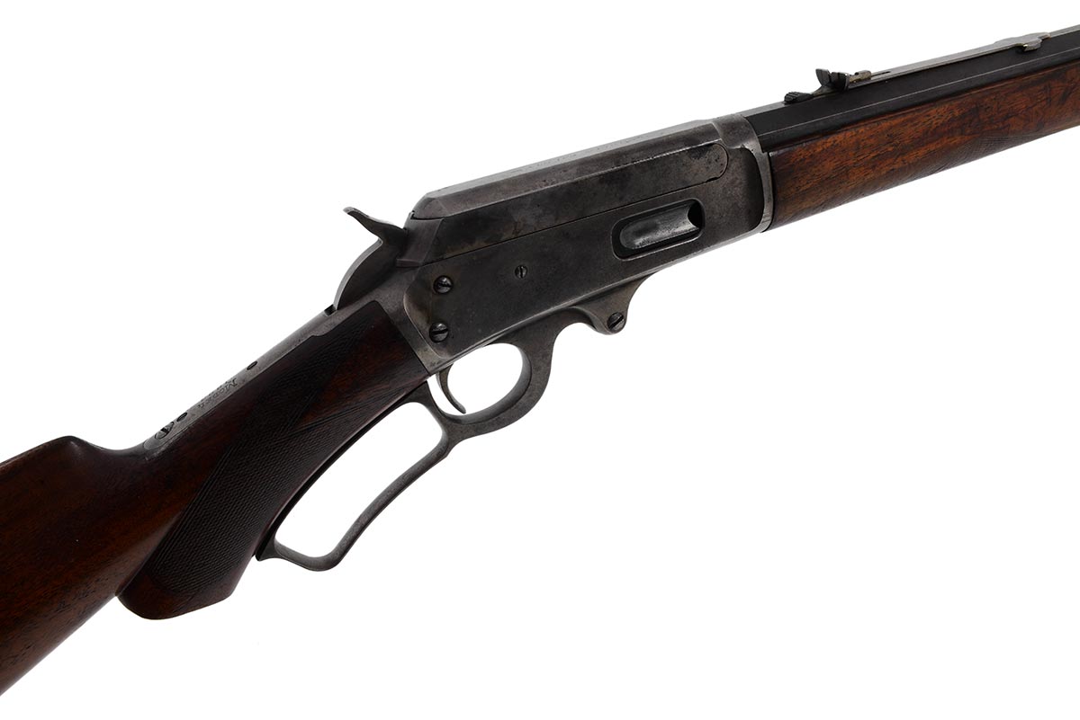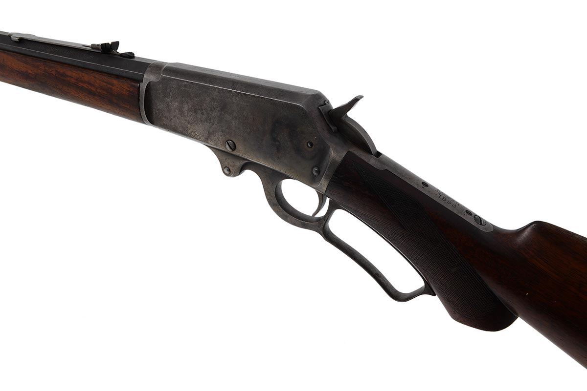 This is an antique Marlin Model 1893 Deluxe rifle chambered in 30-30 Winchester. It features a 26-inch half round/half octagon barrel, Marble front sight, checkered walnut stock, and 10-round magazine tube. The serial number indicates it manufactured in 1898. The barrel and magazine tube retain much of the original bluing with some minor wear and light patina. The receiver, bolt and lever are mostly in the white, but there is still some faint traces of case-coloring remaining. The wood is in nice shape, but the checkering is worn and there are some scuffs, dings and pressure marks. The buttplate is in great shape. The bore is in decent condition with a dull shine and clear rifling, but there is some frosting throughout. This would make a nice addition to a vintage Marlin collection. Buy online today!