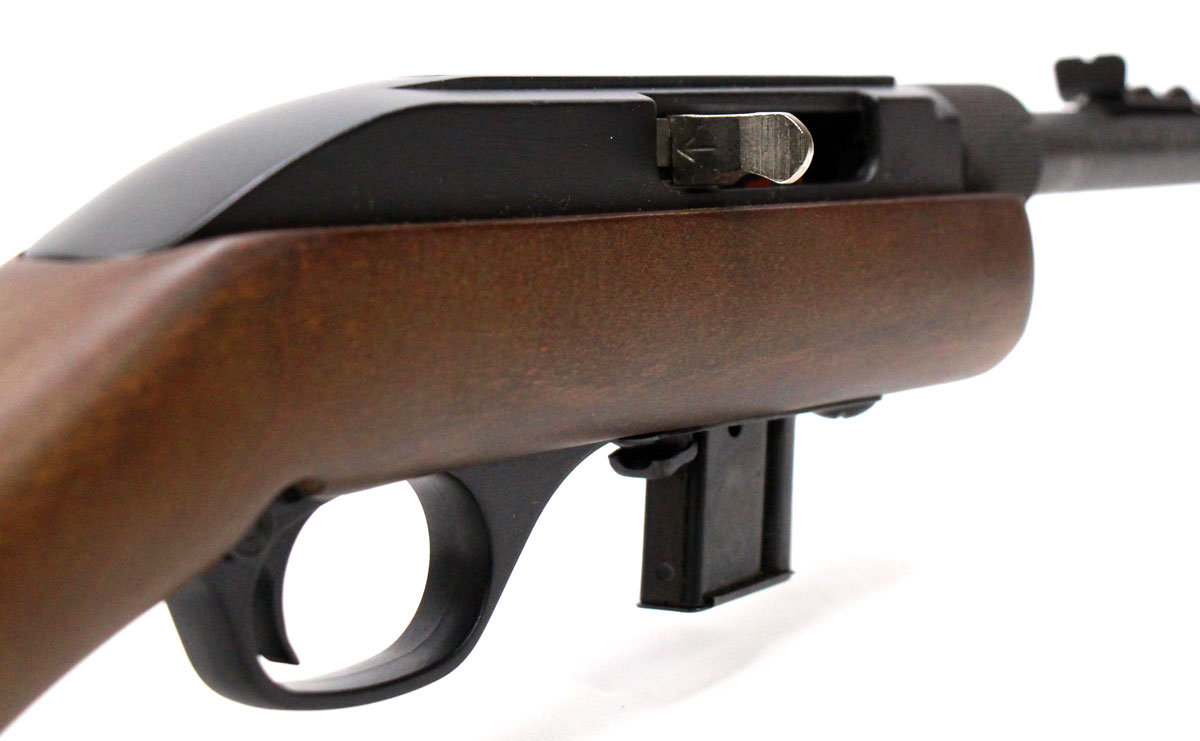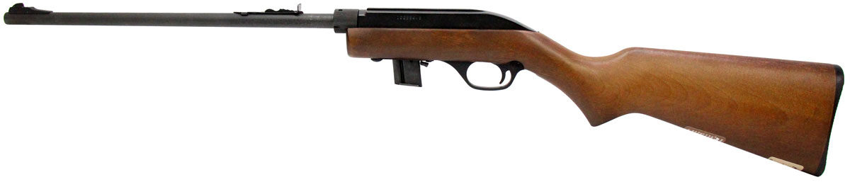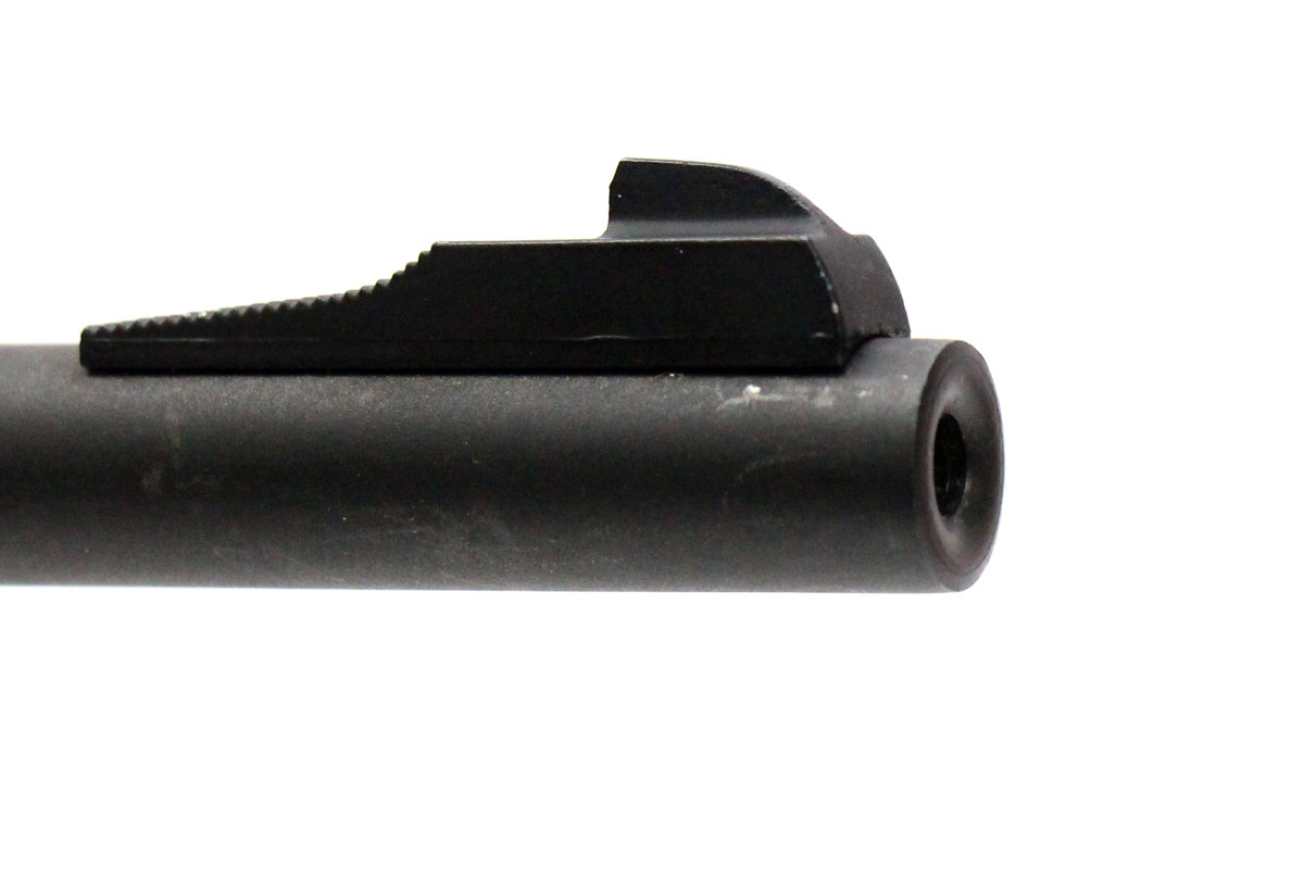 This is a used Marlin 70P Papoose rifle chambered in 22 Long Rifle. It features a 16.25-inch barrel with micro groove rifling, 7-round magazine, adjustable rear sight, grooved receiver rail, and two-piece takedown. Includes carrying case and manual. Overall, this rifle is in good condition with some handling wear on the barrel. Bore condition is good with crisp rifling. This would be a good choice for small game hunting. Buy online today!