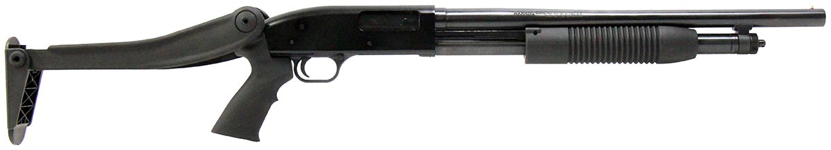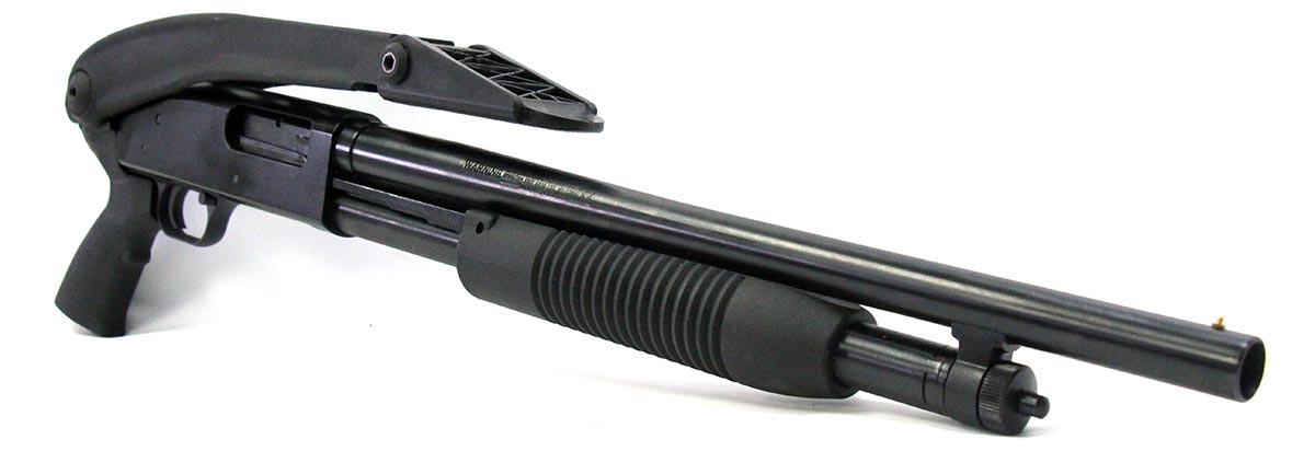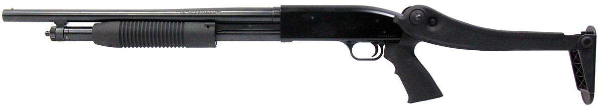 This is a used Maverick 88 shotgun chambered in 12 gauge. It features an 18.5-inch barrel, barrel, 3-inch chamber, fixed cylinder bore choke, cross-bolt safety, pistol grip, and over-folding stock. Overall, this Maverick is in good condition with normal wear on the magazine tube. This would be a good choice for home defense. Buy online today!