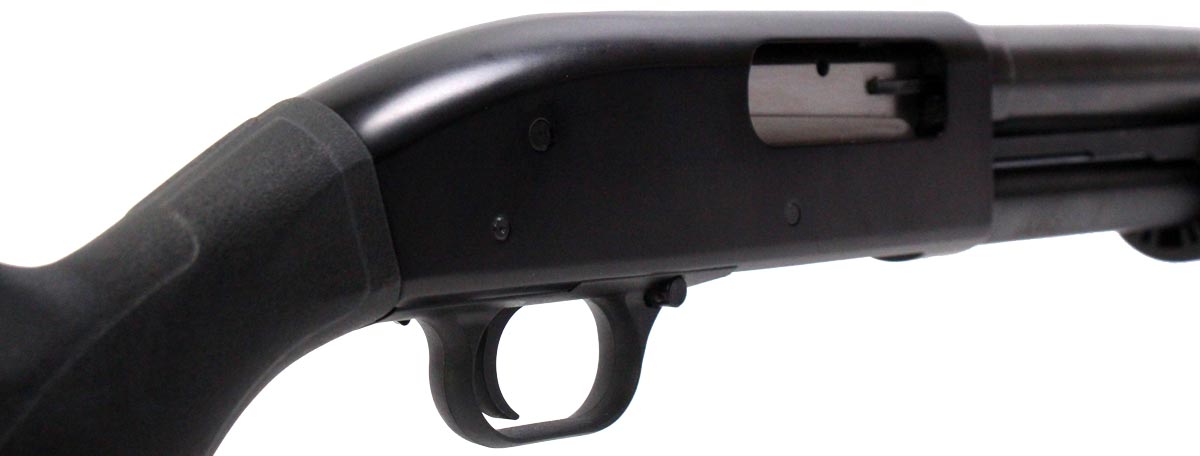This is a used Maverick 88 Security shotgun chambered in 12 gauge. It features a 20-inch barrel, 3-inch chamber, cross-bolt safety, polymer furniture, and fixed cylinder bore choke. Overall, this Maverick is in good condition with some surface corrosion on the barrel exterior and normal wear on the magazine tube. This would be a good choice for home defense. Buy online today!