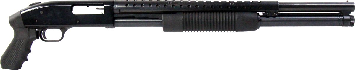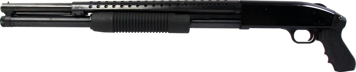 This is a used Mossberg 500 shotgun chambered in 12 gauge. It features a 20-inch barrel, 3-inch chamber, tang safety, pistol grip, heat shield, and fixed cylinder bore choke. Overall, this Mossberg is in good condition with bluing wear throughout the barrel and magazine tube. This would be a good choice for home defense. Buy online today!