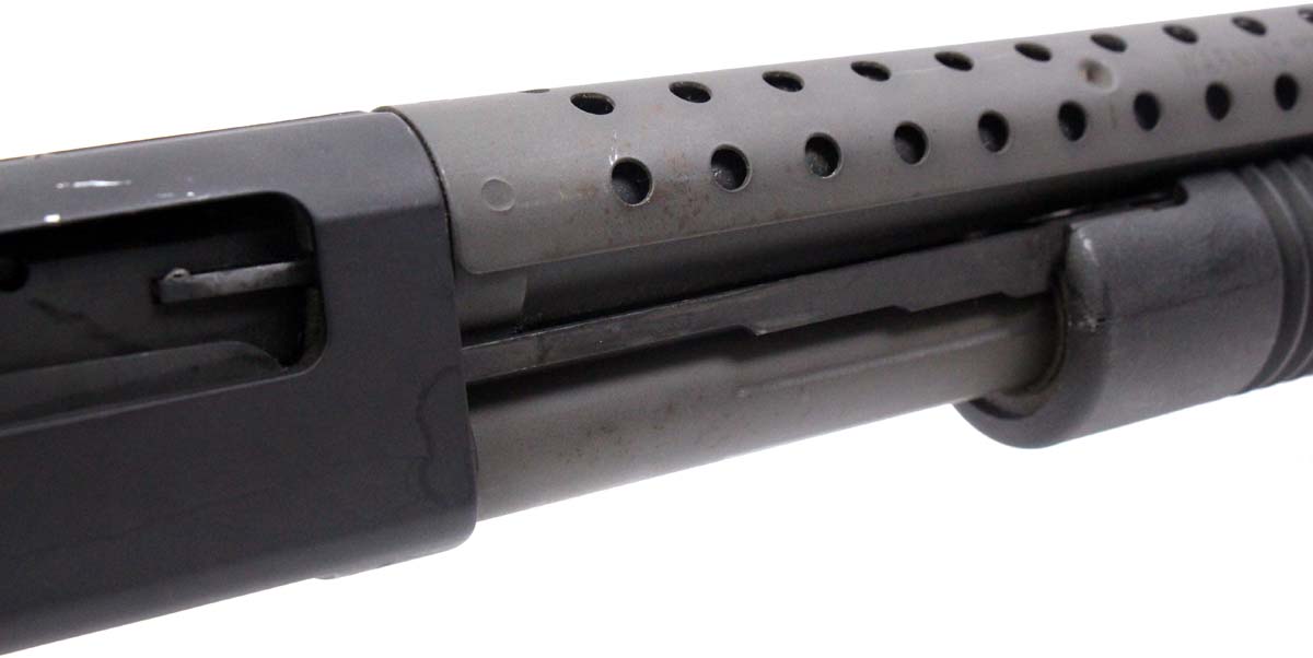 This is a used Mossberg 500A shotgun chambered in 12 gauge. It features a 20-inch barrel, 3-inch chamber, tang safety, pistol grip, heat shield, and fixed cylinder bore choke. Overall, this Mossberg is in good condition with significant handling wear on the receiver. The barrel, heatshield, and magazine tube have surface corrosion and the front sight bead is broken. This would be a good choice for home defense. Buy online today!