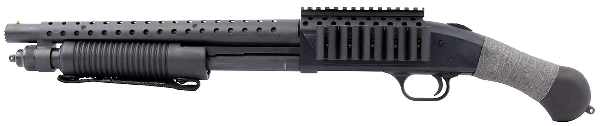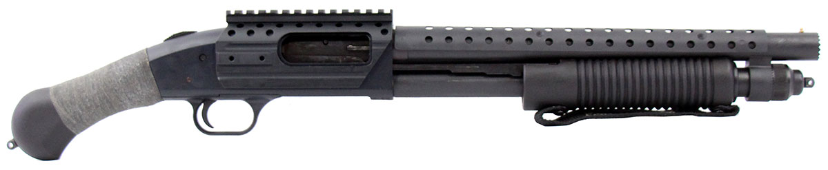 This is a used Mossberg 590 Shockwave chambered in 12 gauge. It features a 14-inch barrel with breacher muzzle, 3-inch chamber, fixed cylinder bore choke, tang safety, side saddle, heat shield, optic rail, bird's head grip, and bead sight. Includes factory box. Overall, this Mossberg is in good condition with normal use wear on the barrel, magazine tube, and receiver. This would be a good choice for home defense. Buy online today!