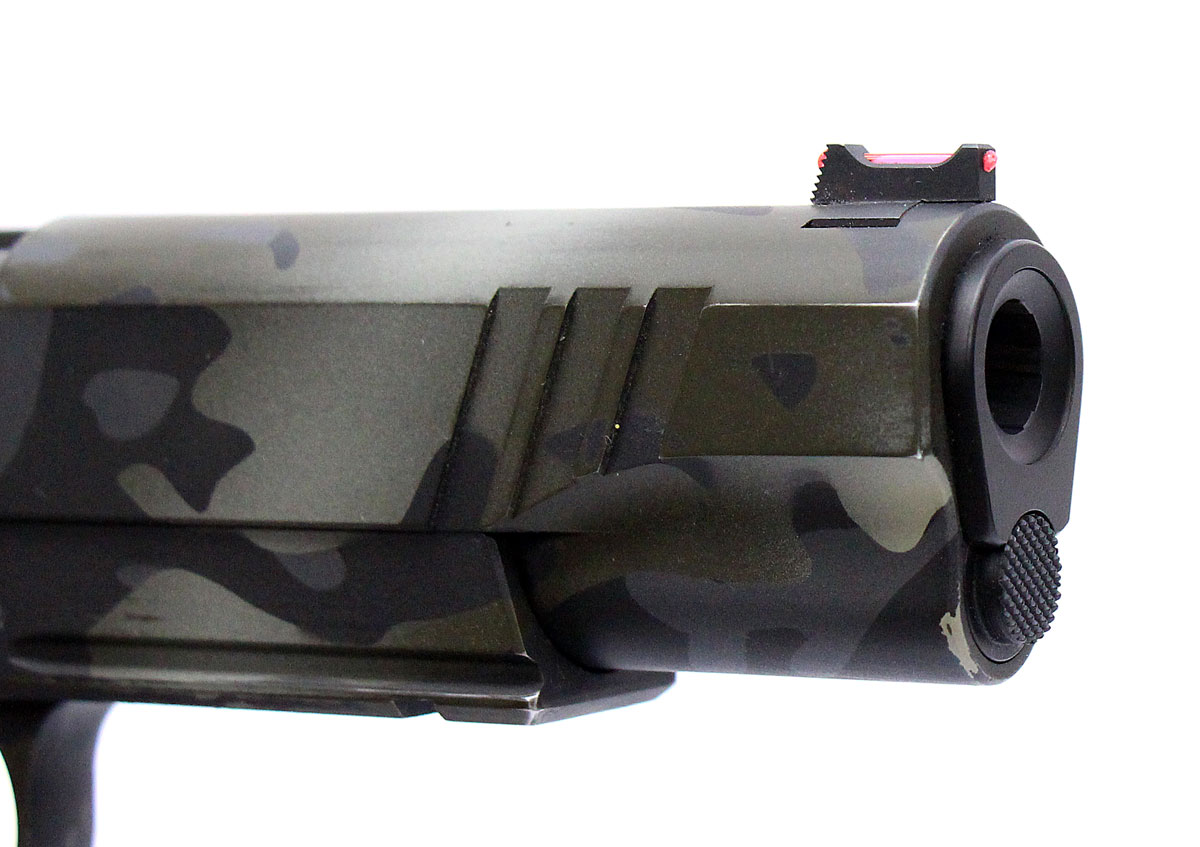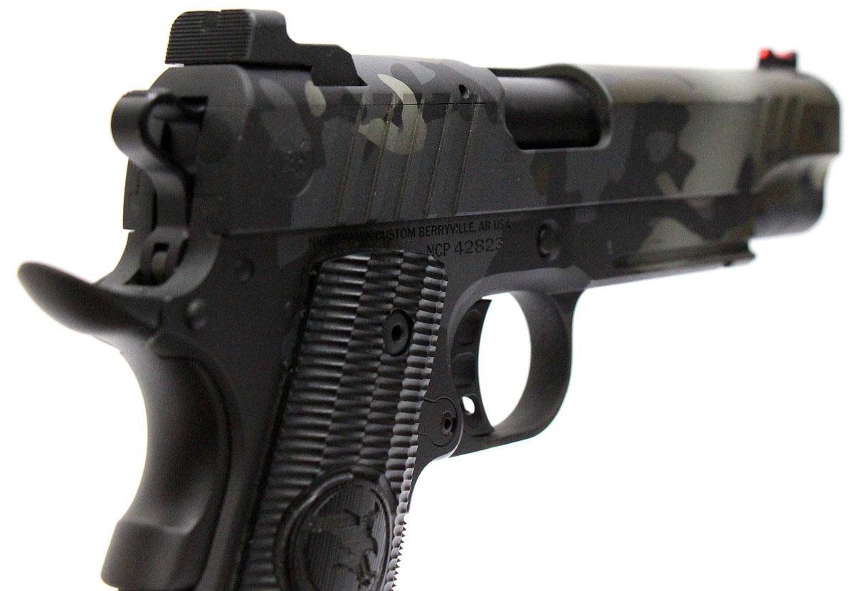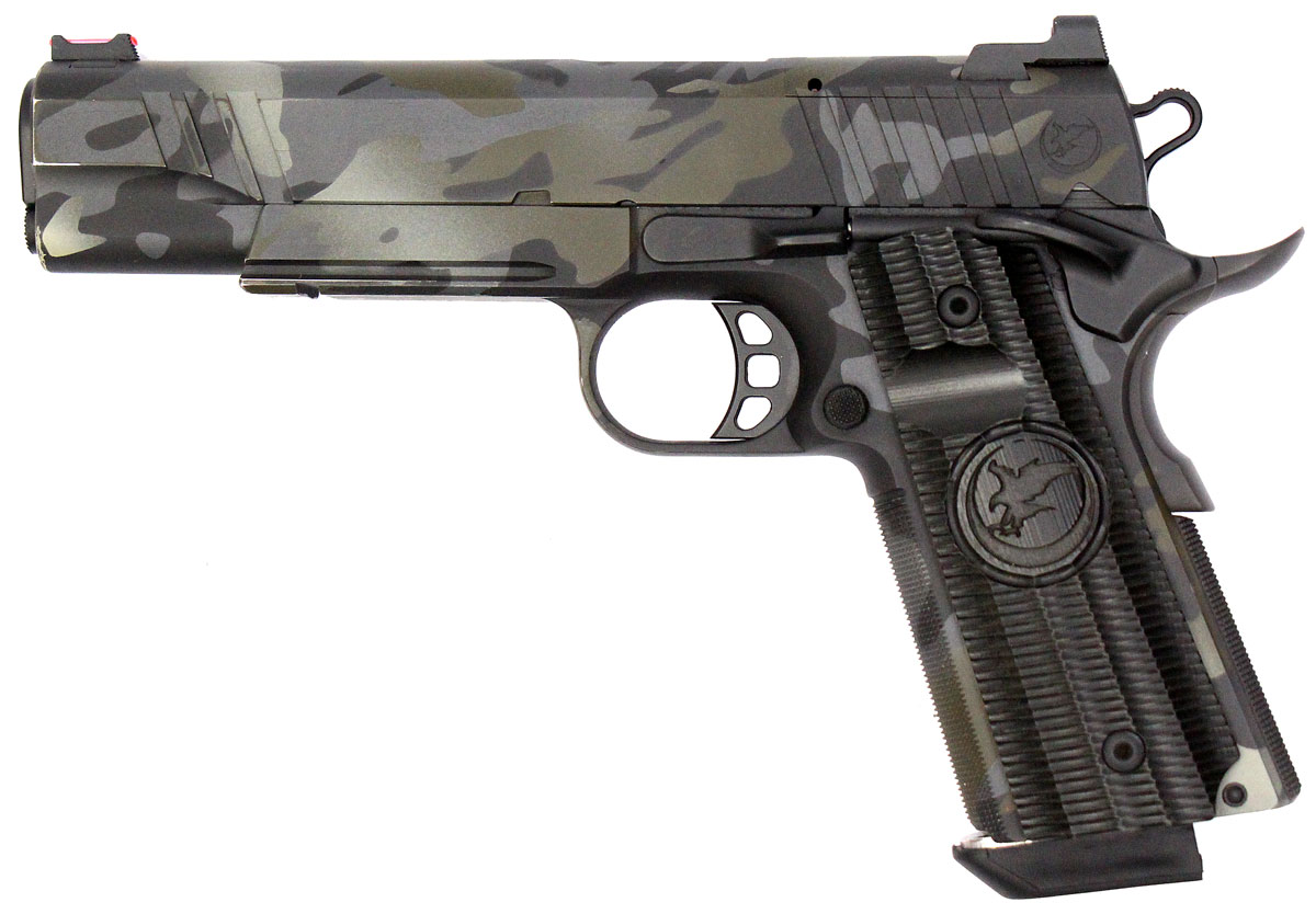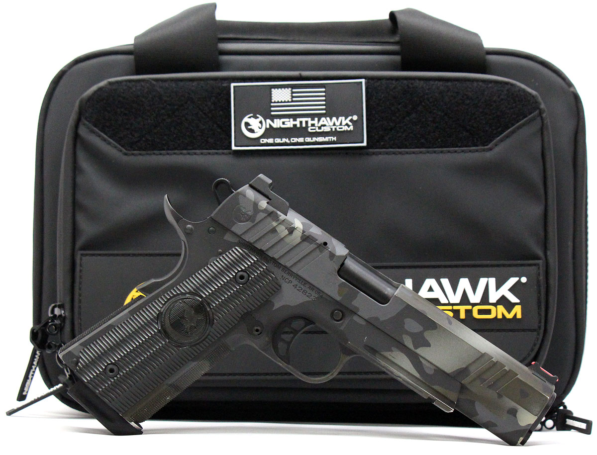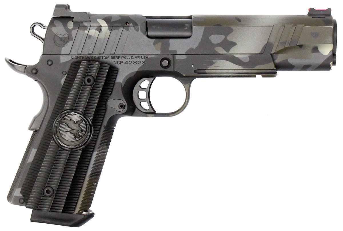 This is a used Nighthawk Custom 1911 GRP pistol chambered in 10mm. It features a 5-inch barrel, 9-round magazine, fiber optic front sight, Heine fixed rear sight, optics ready slide, thumb safety, grip safety, accessory rail, G10 grips, and camo finish. Includes factory case, manual, test target, QC inspection sheet, bushing wrench, one 8-round magazine, two 9-round magazines, and IOS RMR optic adaptor plate. Overall, this pistol is in good condition with normal use wear on the slide and barrel. This would be a good choice for target shooting. Buy online today!