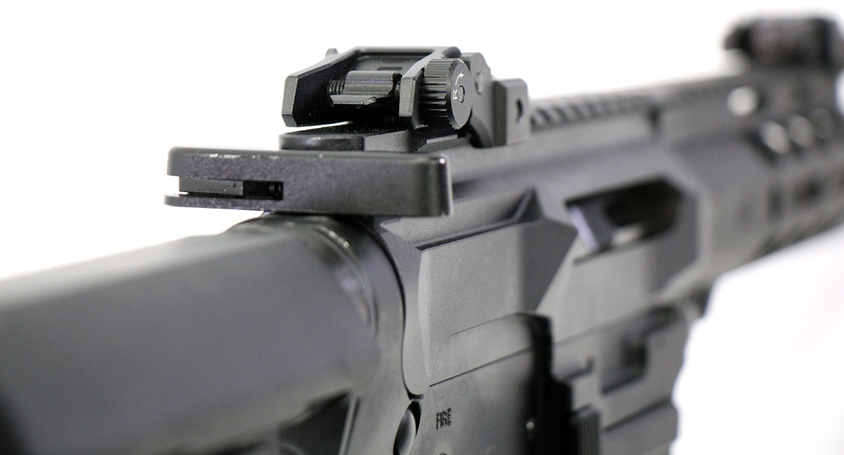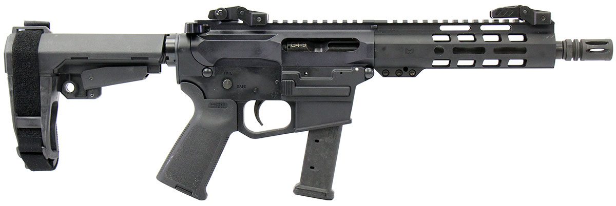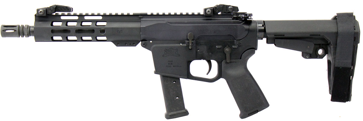 This is a used Palmetto State Armory PG-9 AR pistol chambered in 9mm. It features an 8-inch barrel, 21-round magazine, folding sights, M-LOK handguard, and SBA3 pistol brace. Overall, this PSA is in good condition with normal use wear on the receiver. This would be a good choice for recreational target shooting. Buy online today!