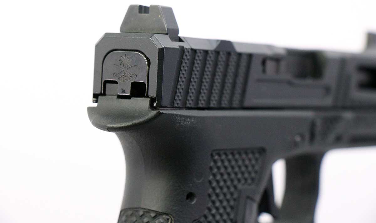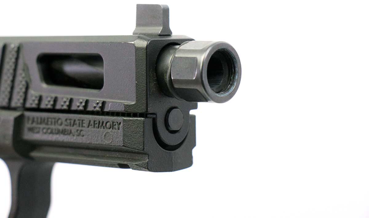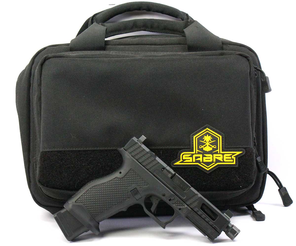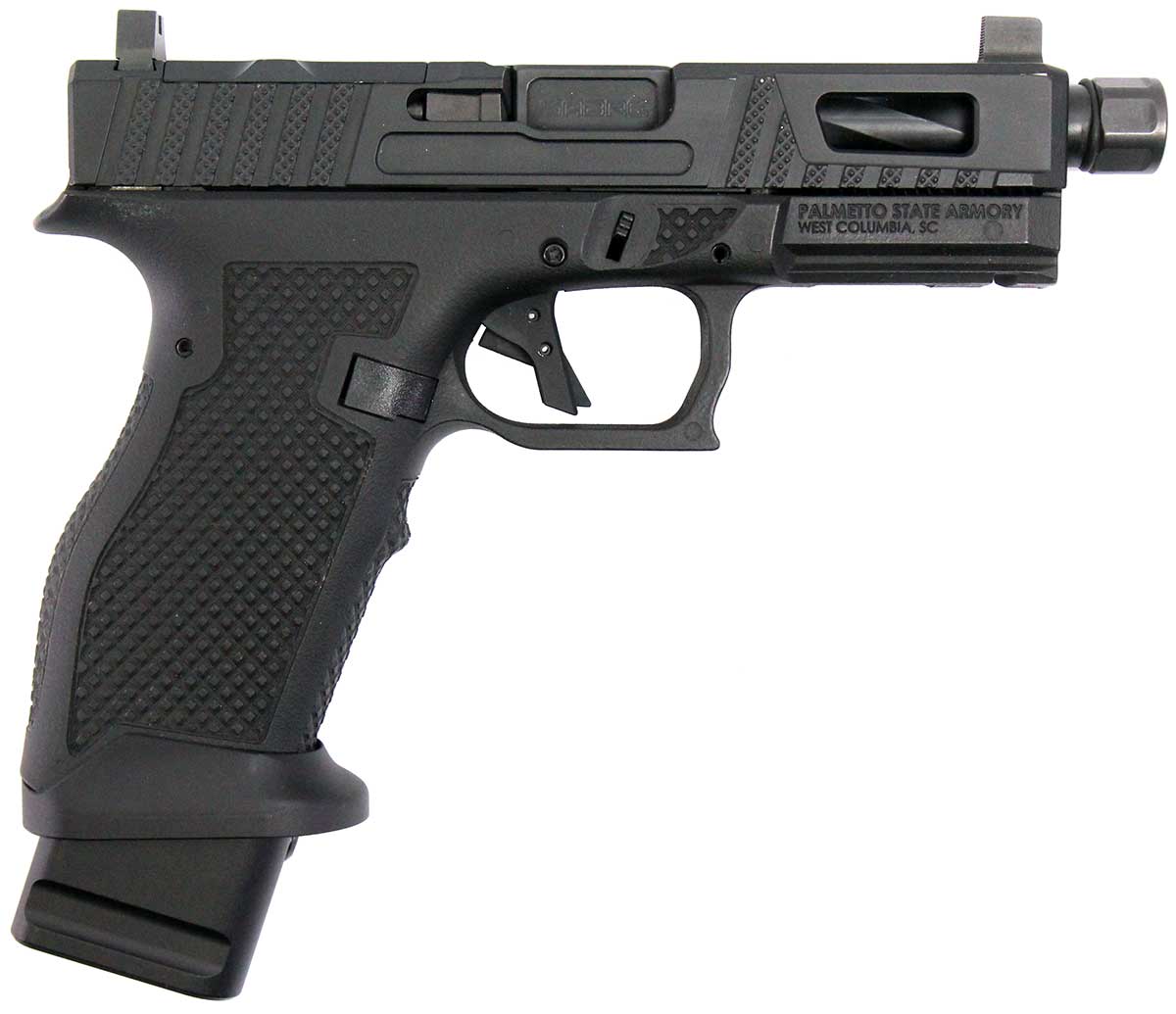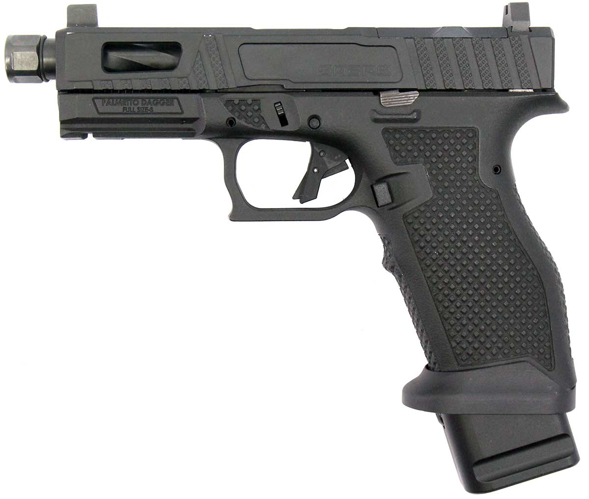 This is a used Palmetto State Armory Sabre Dagger pistol chambered in 9mm. It features a 4.5-inch barrel, 17-round magazines with +5 base pads, suppressor height sights, flared magwell, and optics ready slide cut for Trijicon RMR optic footprint. Includes factory case and three magazines. Overall, this pistol is in good condition with normal use wear on the slide and barrel. This would be a good choice for target shooting. Buy online today!