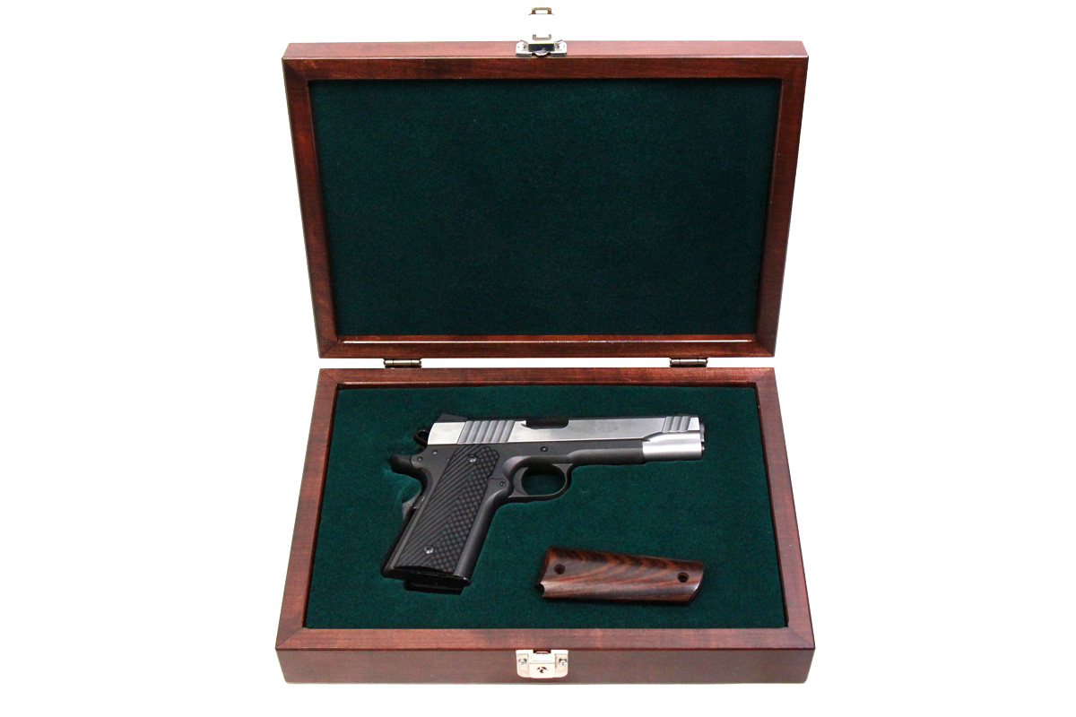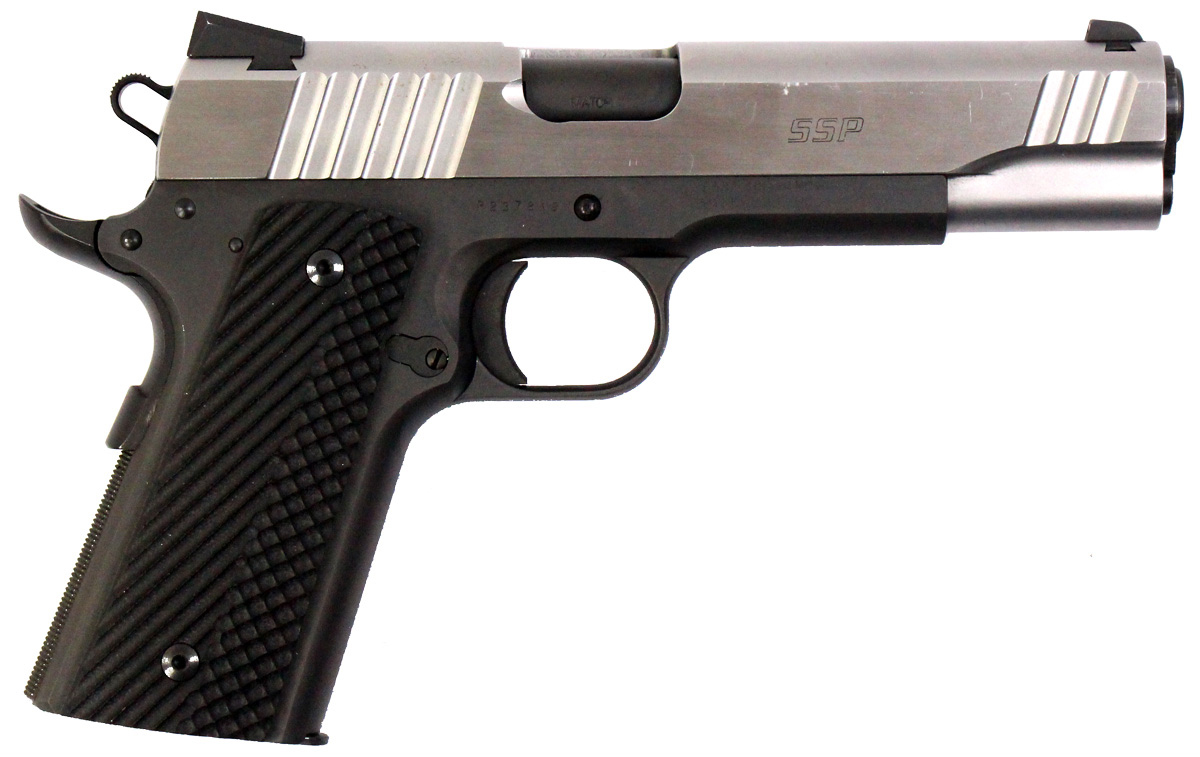 This is a used Para Ordnance 1911 SSP pistol chambered in 9mm. It features a 5-inch barrel, 8-round magazine, 3-dot sights, thumb safety, grip safety, stainless slide, and G10 grips. Includes felt-lined wooden case and a set of wood grips. Overall, this pistol is in good condition with normal use wear on the barrel, slide, and frame. This would be a good choice for home defense. Buy online today!