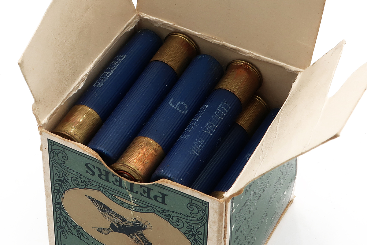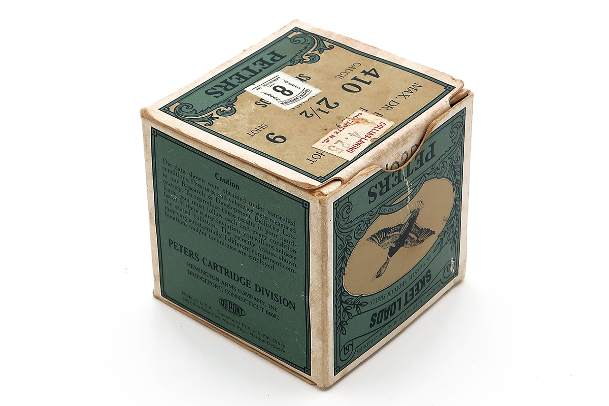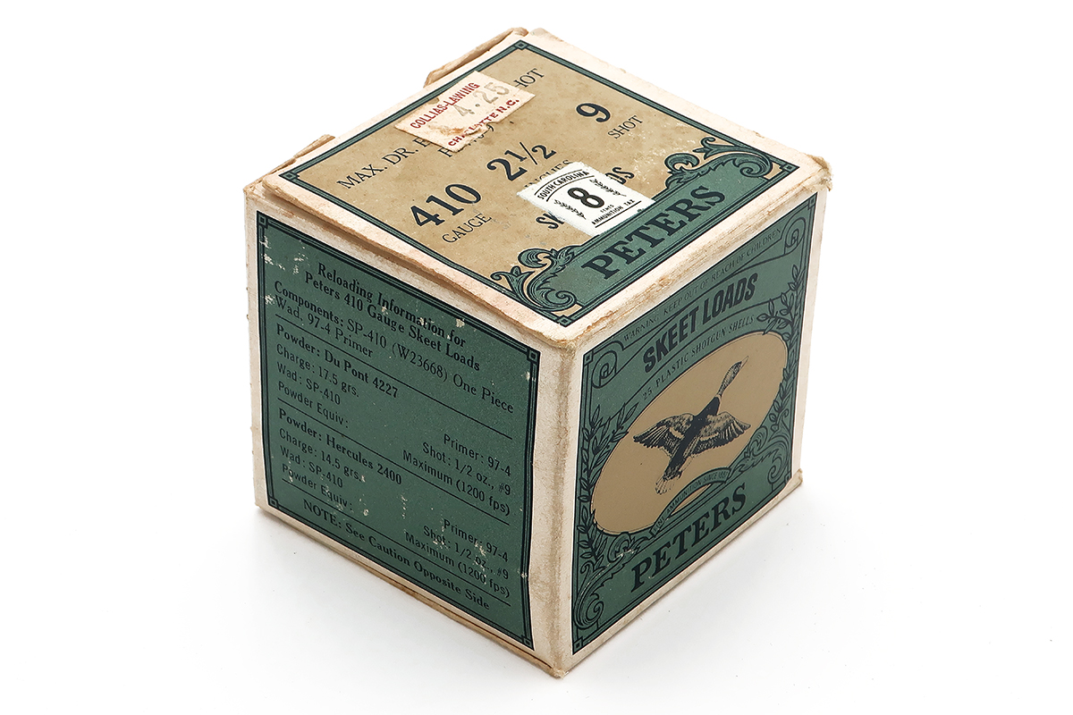 This is a 24-round is a box of Peters Cartridge Division vintage 410 bore shotgun ammo. This 2.5-inch #9 shot skeet load ammo comes in the early blue-and-white colored box. The ammo is in good condition, while the box shows some wear, staining and creases. This would be a good choice for anyone who collects vintage ammunition.