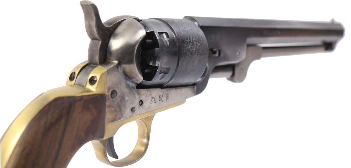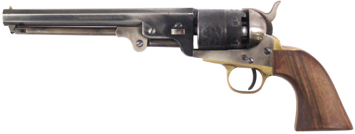 This is a used Pietta 1851 Navy revolver chambered for 44 caliber projectiles. It features a 7.5-inch octagon barrel, 6-round cylinder, wood grips, and aged finish. Overall, this Pietta is in good condition with normal wear on the frame and cylinder. This would be a good choice for recreational target shooting. Buy online today!
