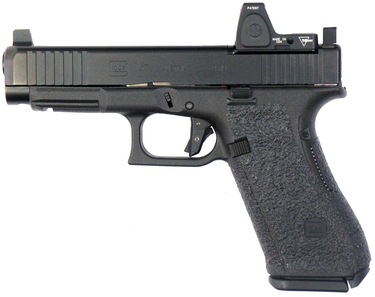 This is a used Glock 47 MOS pistol chambered in 9mm. It features a 4.49-inch barrel, 17-round magazines, accessory rail, Talon grip tape, Johnny Glocks trigger, Trijicon RMR RM06 red dot, and Trijicon suppressor height night sights. Includes factory box, manual, magazine loading tool, and two magazines. Overall, this Glock is in very good condition with minimal wear. this would be a great choice for home defense. Buy online today!