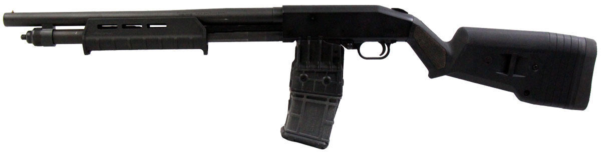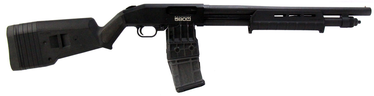 This is a used Mossberg 590M shotgun chambered in 12 gauge. It features an 18.5-inch barrel, 2.75-inch chamber, 10-round detachable magazine (compatible with 2.75-inch shells only), fixed cylinder bore choke, tang safety, and Magpul stock. Overall, this Mossberg is in good condition with handling wear on the magazine tube, stock, and receiver. This would be a good choice for home defense. Buy online today!