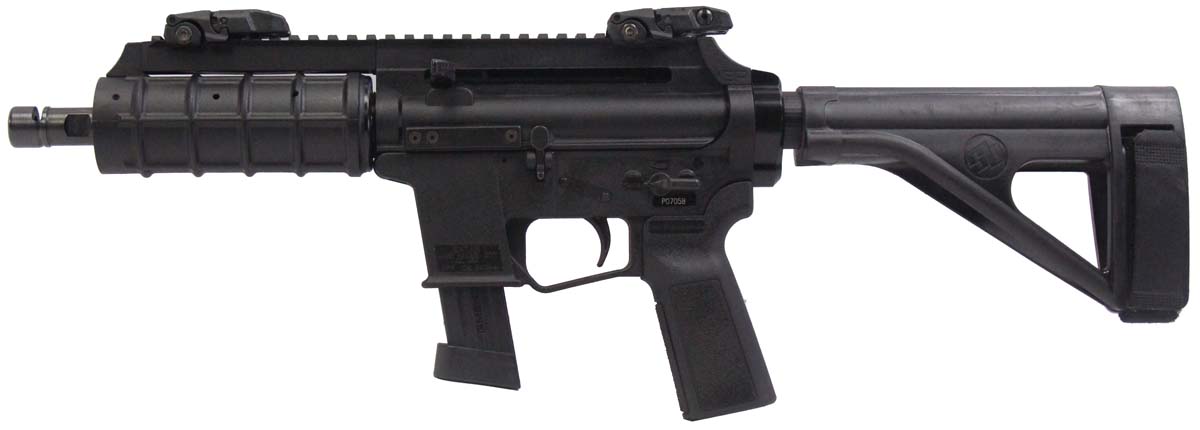 This is a used Extar Arms EP9 pistol chambered in 9mm. It features a 6.5-inch barrel, 18-round magazine, Magpul MBUS sights, polymer receiver, and SB Tactical pistol brace. Overall, this pistol is in good condition with some handling wear on the receiver. This would be a good choice for home defense. Buy online today!