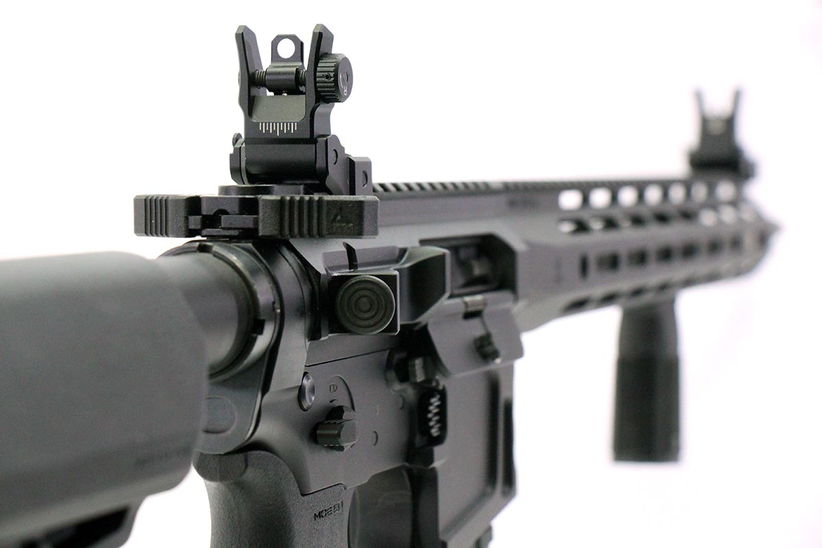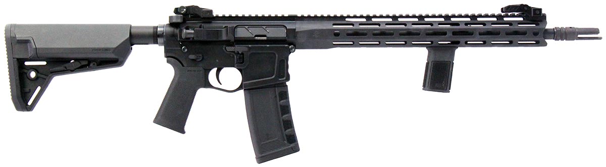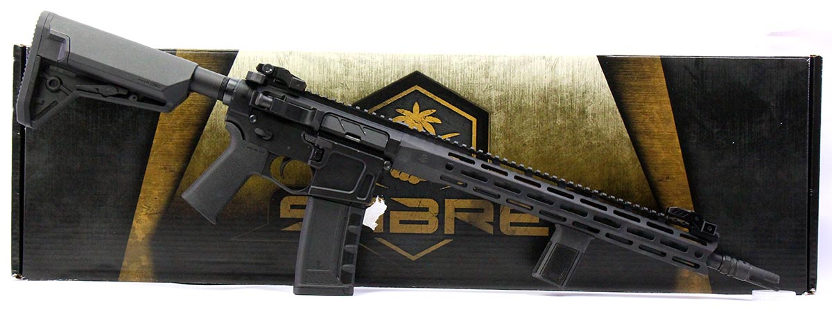 This is a used Palmetto State Armory Sabre-15 rifle chambered in 5.56 NATO. It features a 16-inch barrel, 30-round magazine, M-LOK handguard, mid-length gas system, folding sights, Magpul SL-S stock, Radian Raptor charging handle, and ambidextrous lower receiver. Includes factory box and manual. Overall, this rifle is in good condition with some handling wear on the receiver. Bore condition is good with crisp rifling. This would be a good choice for home defense. Buy online today!