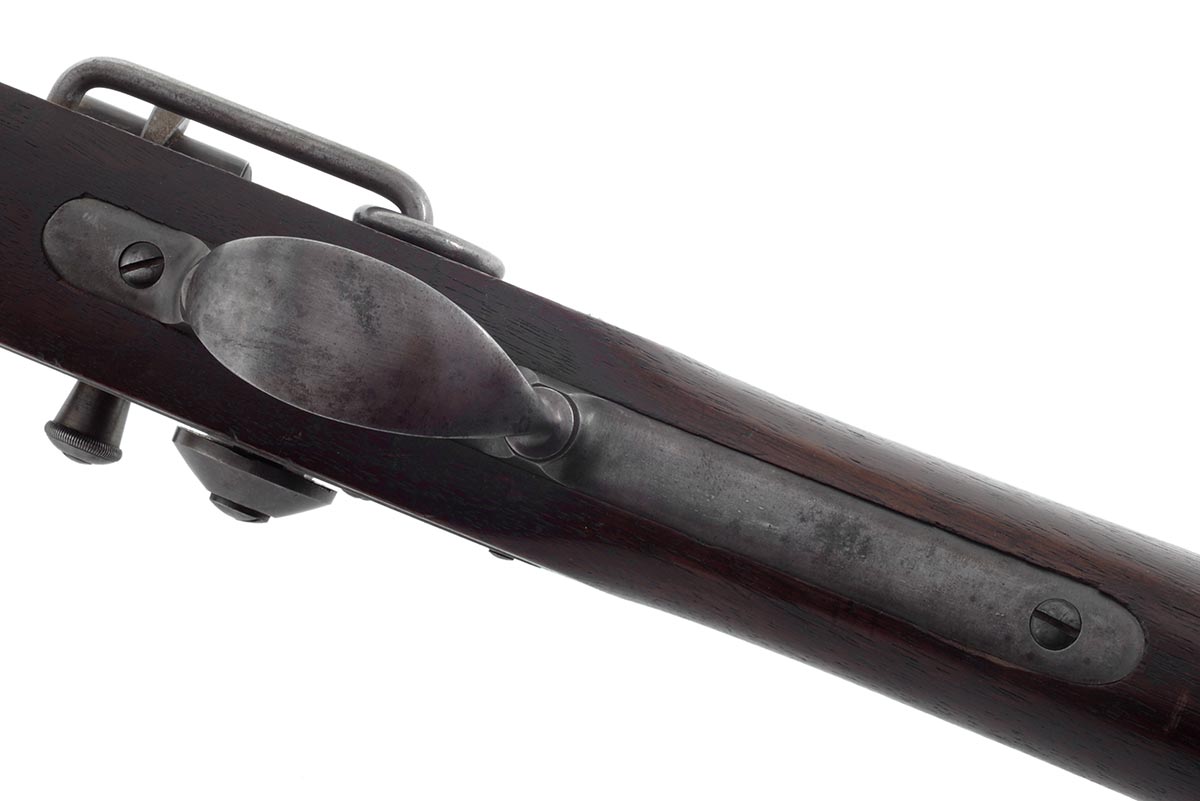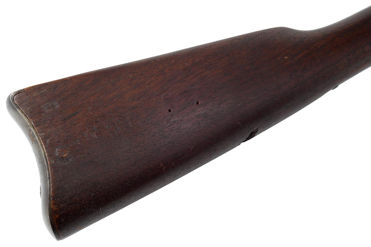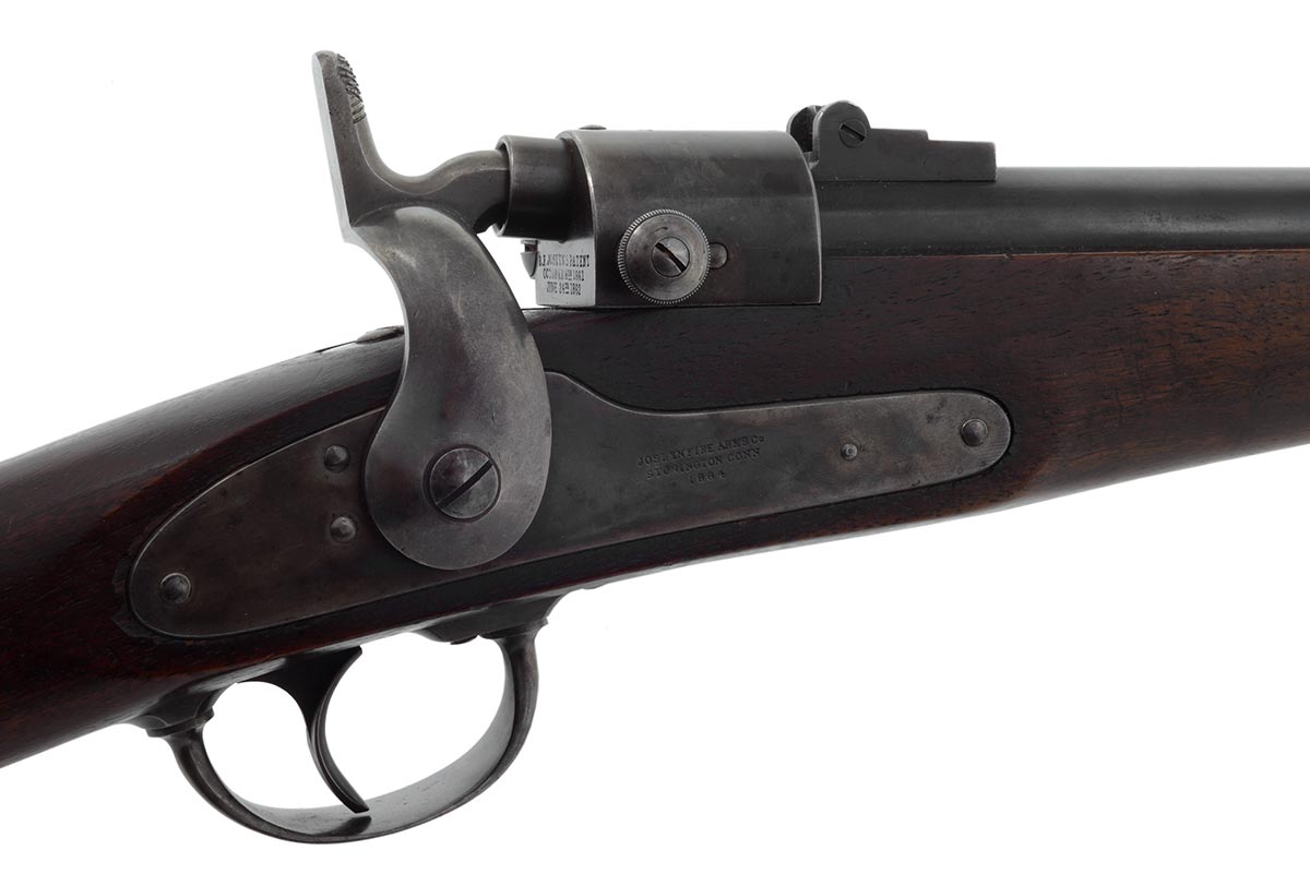 This is an exceptional example of a US Civil War-era Joslyn Model 1864 Carbine chambered in .52 Rimfire. It features a breech-loading design with 22-inch barrel. First introduced in 1864, Joslyn Carbines saw limited use during the Civil War. Cartouches include "GWS" (George W. Sherman) stamp on left side of barrel. Sherman is listed as inspector on the Joslyn 1864 carbine. The left side of stock has two identical cartouches in rectangular box "FDL" (Frederick D. Livingston). Livingston was a noted inspector of the Second Model Joslyn carbine. Livingston inspected at least 8,000 Joslyn carbines delivered between July 1864 and February 1865. The buttplate is stamped "US". Just ahead of the buttplate is another black letter "FDL" cartouche. Lock is stamped "JOSLYN FIREARMS CO. STONINGTON CONN" and dated 1864. The rear of the breechblock exhibits the clear patent stamping of “B.F. JOSLYN’S PATENT / OCTOBER 8TH 1861 / JUNE 24th 1862”. Overall condition of this carbine is above average with a bright shiny bore and sharp rifling. Everything works as it should; it probably shoots as good today as it did 162 years ago. The wood is in very fine original shape with clear markings. There is what appears to be a bullet scar on the bottom of the buttstock, and chip just behind the barrel band on the right side. The barrel retains most of the original bluing and the lock still has very nice case coloring. This is a museum grade example of an 1864 Joslyn. Buy online today!