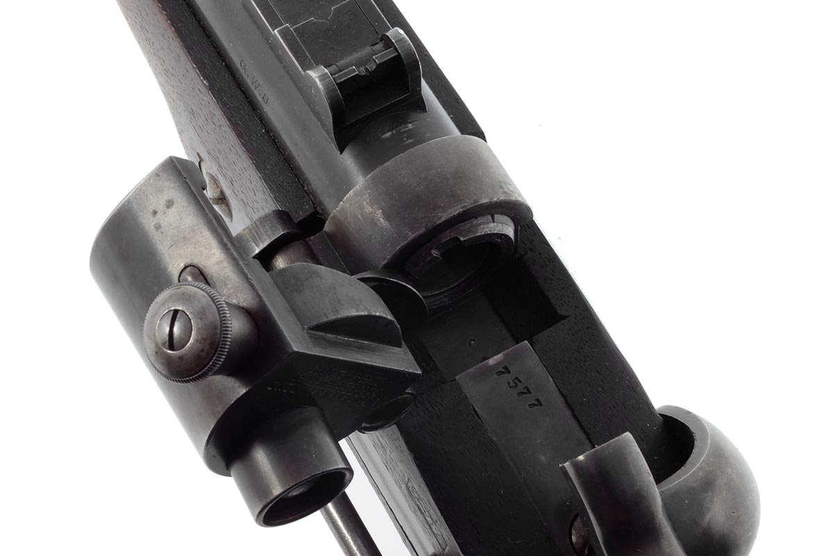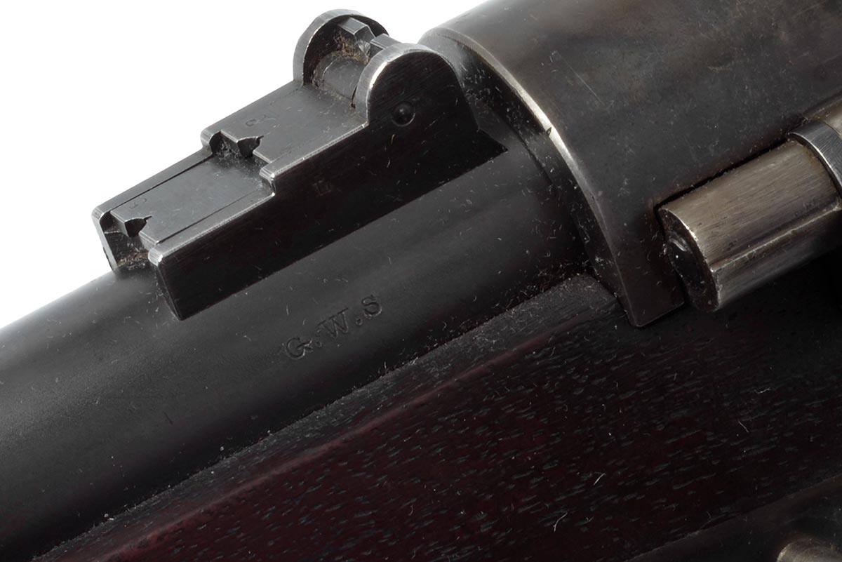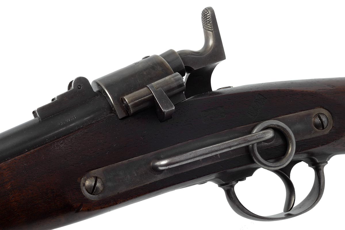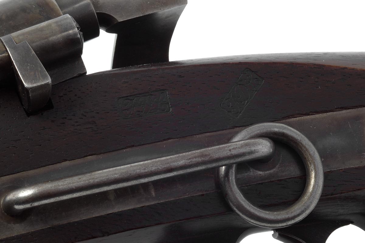This is an exceptional example of a US Civil War-era Joslyn Model 1864 Carbine chambered in .52 Rimfire. It features a breech-loading design with 22-inch barrel. First introduced in 1864, Joslyn Carbines saw limited use during the Civil War. Cartouches include "GWS" (George W. Sherman) stamp on left side of barrel. Sherman is listed as inspector on the Joslyn 1864 carbine. The left side of stock has two identical cartouches in rectangular box "FDL" (Frederick D. Livingston). Livingston was a noted inspector of the Second Model Joslyn carbine. Livingston inspected at least 8,000 Joslyn carbines delivered between July 1864 and February 1865. The buttplate is stamped "US". Just ahead of the buttplate is another black letter "FDL" cartouche. Lock is stamped "JOSLYN FIREARMS CO. STONINGTON CONN" and dated 1864. The rear of the breechblock exhibits the clear patent stamping of “B.F. JOSLYN’S PATENT / OCTOBER 8TH 1861 / JUNE 24th 1862”. Overall condition of this carbine is above average with a bright shiny bore and sharp rifling. Everything works as it should; it probably shoots as good today as it did 162 years ago. The wood is in very fine original shape with clear markings. There is what appears to be a bullet scar on the bottom of the buttstock, and chip just behind the barrel band on the right side. The barrel retains most of the original bluing and the lock still has very nice case coloring. This is a museum grade example of an 1864 Joslyn. Buy online today!