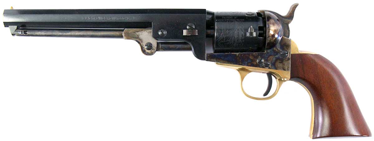 This is a used Traditions 1851 Navy revolver chambered for 36 caliber projectiles. It features a 7.5-inch octagon barrel, 6-round cylinder, percussion ignition system, case color frame, and wood grips. Includes factory box and manual. Overall, this revolver is in good condition with normal use cylinder turn lines. This would be a good choice for recreational target shooting. Buy online today!