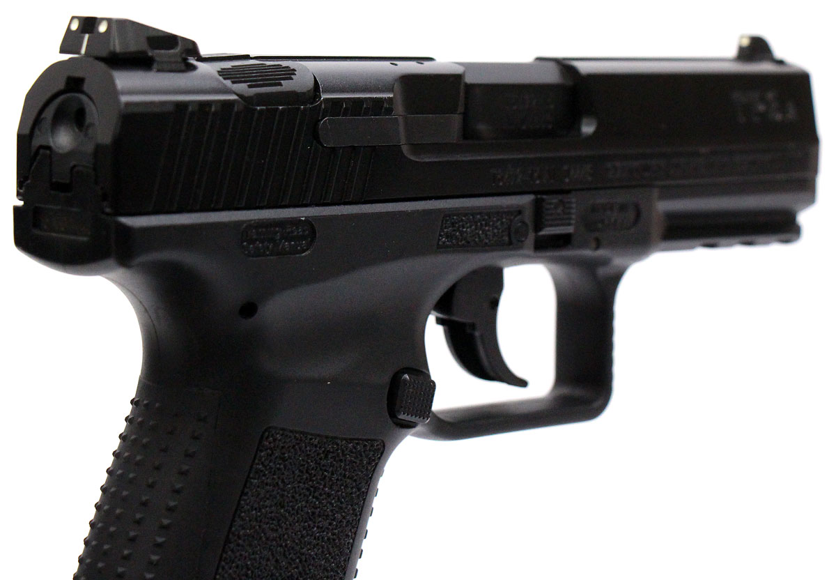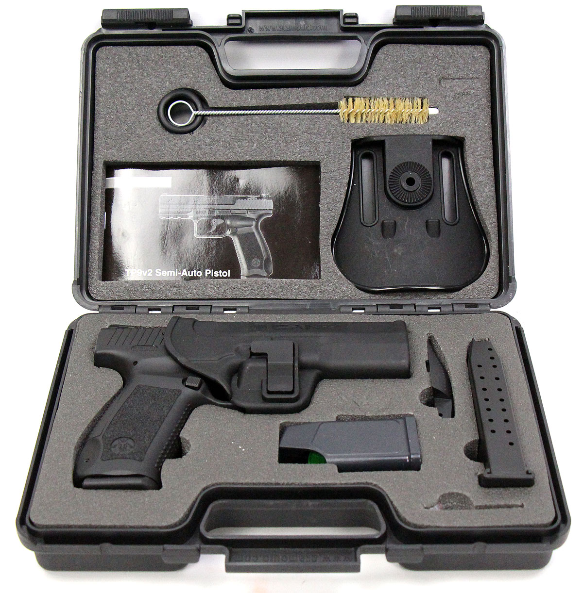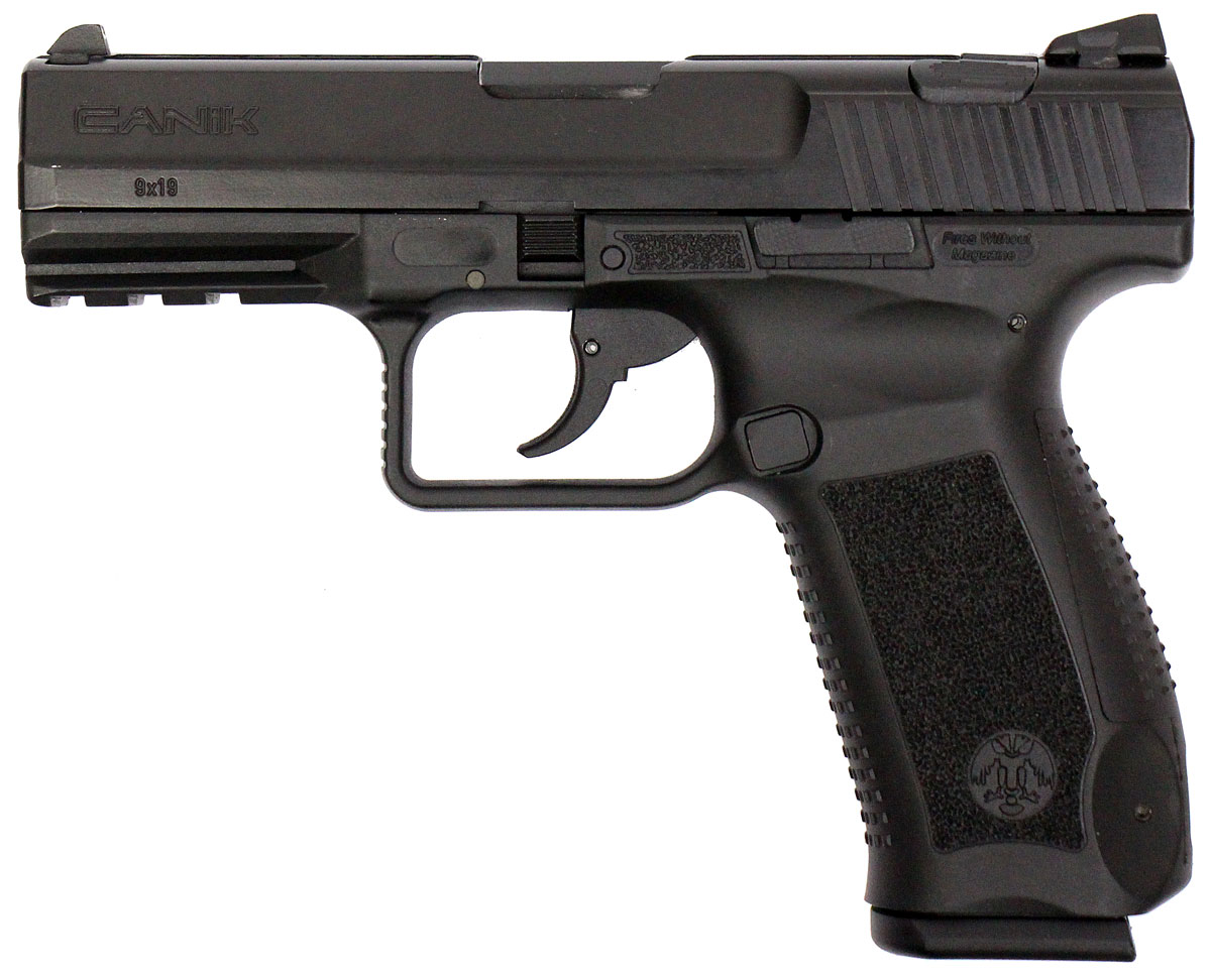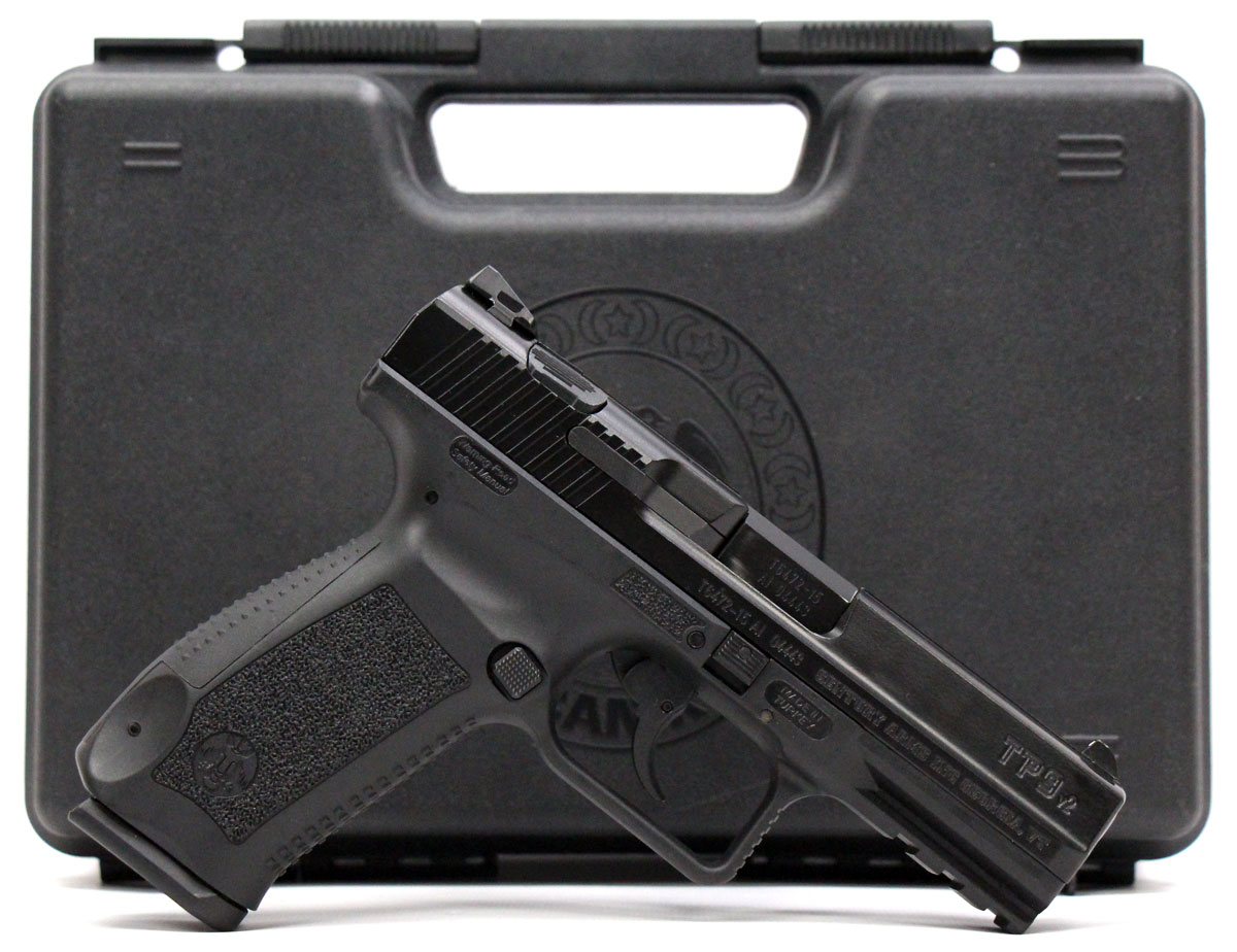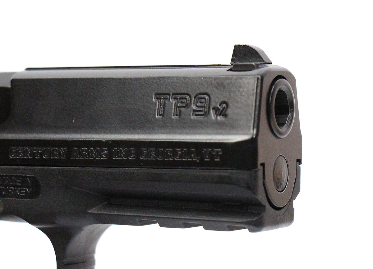 This is a used Century Arms Canik TP9V2 pistol chambered in 9mm. It features a 4-inch barrel, 17-round magazine, fixed 3-dot sights, ambidextrous magazine release button, and accessory rail. Includes factory box, two magazines, manual, cleaning brush, magazine loading tool, and right-handed paddle holster. Overall, this pistol is in good condition with normal use wear on the slide and barrel. This would be a good choice for home defense. Buy online today!