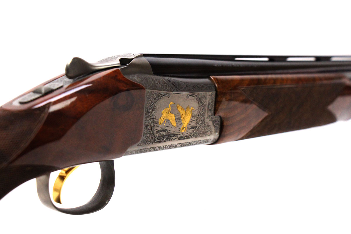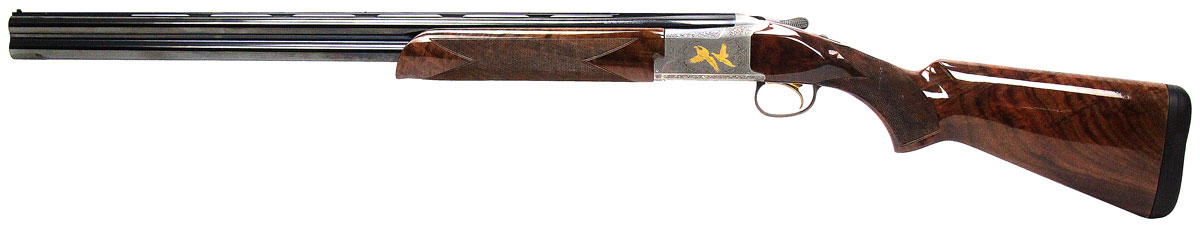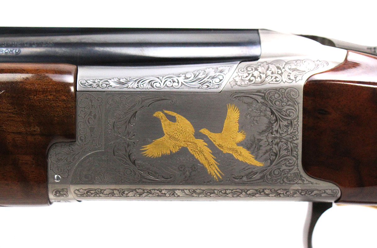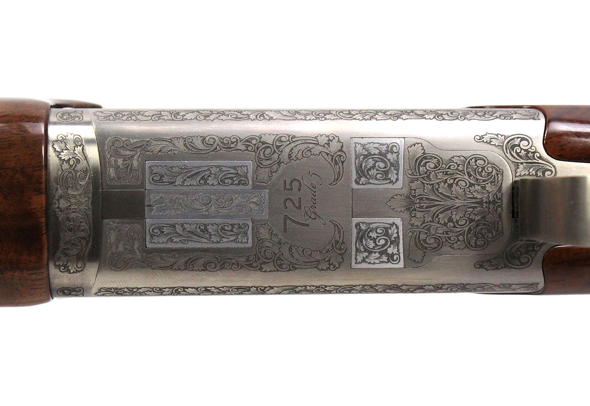 This is a used Browning Citori 725 Field Grade 5 shotgun chambered in 12 gauge. It features 28-inch barrels, 3-inch chambers, 14.25-inch length of pull, automatic safety, screw-in full choke, screw-in modified choke, ejectors, high gloss walnut furniture, and silver nitride receiver with engraved gold enhanced pheasants on the left side and mallards on the right. Overall, this shotgun is in good condition with some handling wear on the stock. Top lever is right of center and lockup is tight. This would be a good choice for hunting. Buy online today!