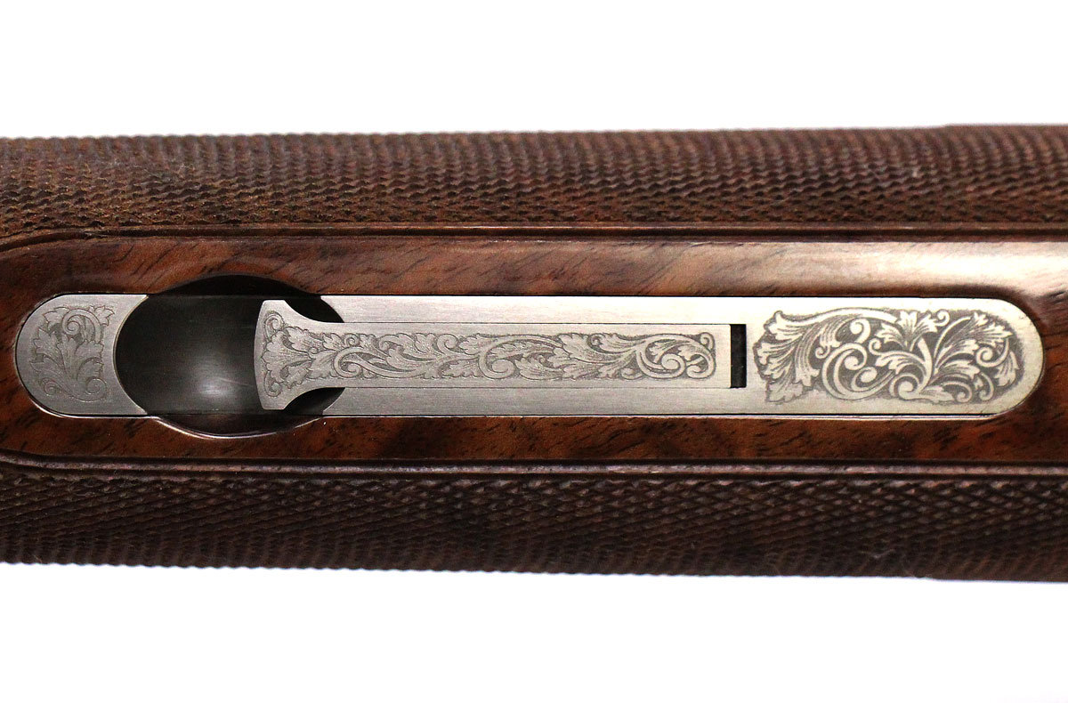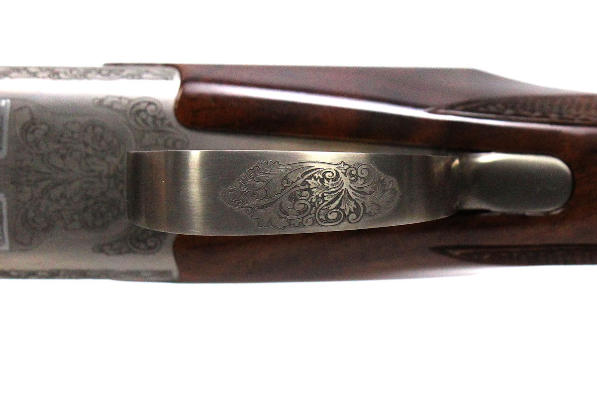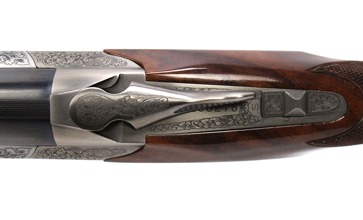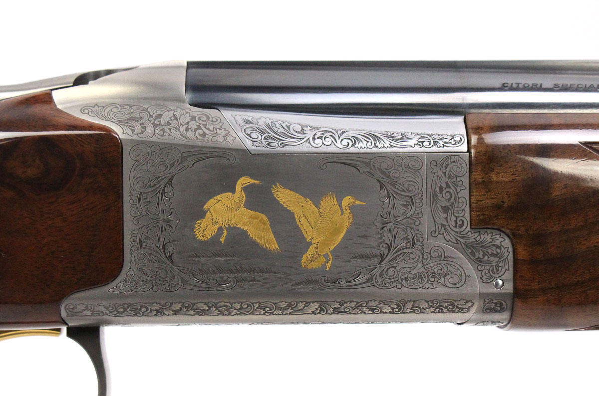 This is a used Browning Citori 725 Field Grade 5 shotgun chambered in 12 gauge. It features 28-inch barrels, 3-inch chambers, 14.25-inch length of pull, automatic safety, screw-in full choke, screw-in modified choke, ejectors, high gloss walnut furniture, and silver nitride receiver with engraved gold enhanced pheasants on the left side and mallards on the right. Overall, this shotgun is in good condition with some handling wear on the stock. Top lever is right of center and lockup is tight. This would be a good choice for hunting. Buy online today!