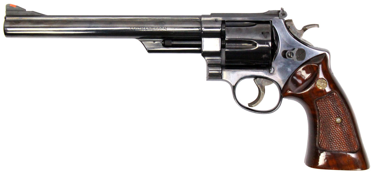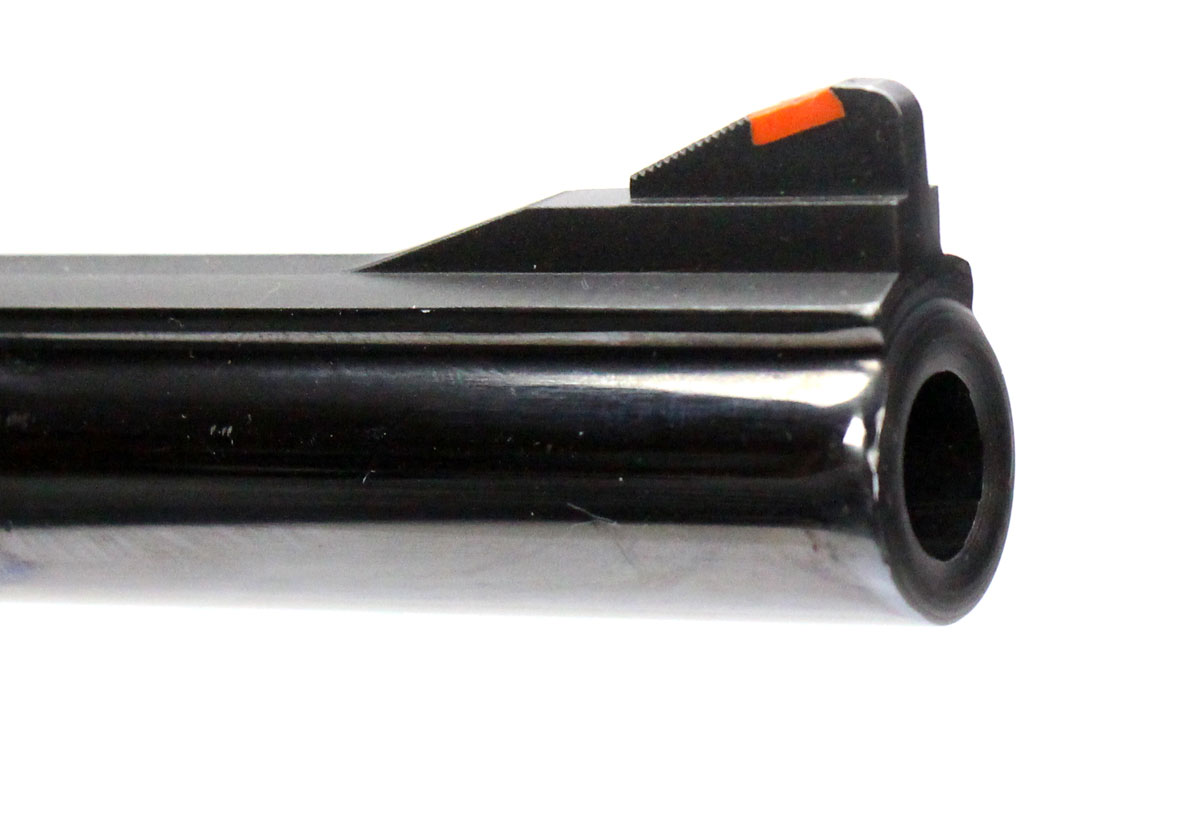 This is a used Smith & Wesson Model 25-5 revolver chambered in 45 Long Colt. It features an 8.375-inch pinned barrel, 6-round cylinder, adjustable rear sight, red ramp front sight, target hammer, target trigger, blued finish, and wood grips with Smith & Wesson medallions. Overall, this Smith is in good condition with normal use cylinder turn lines. This would be a good choice for target shooting. Buy online today!