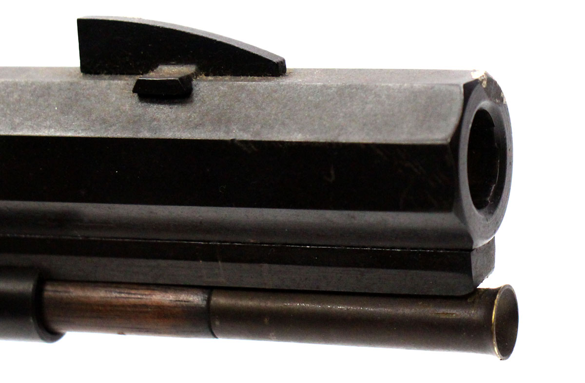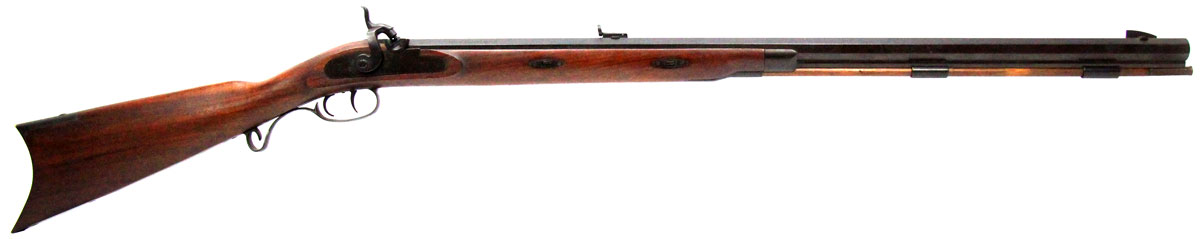 This is a used Lyman Great Plains rifle chambered for 54 caliber projectiles. It features a 32-inch octagon barrel, percussion ignition system, wooden ramrod, set trigger, and buckhorn rear sight. Overall, this rifle is in good condition with some handling wear on the stock and barrel. The barrel shows signs of bluing wear. Bore condition is good with crisp rifling. This would be a good choice for recreational target shooting. Buy online today!