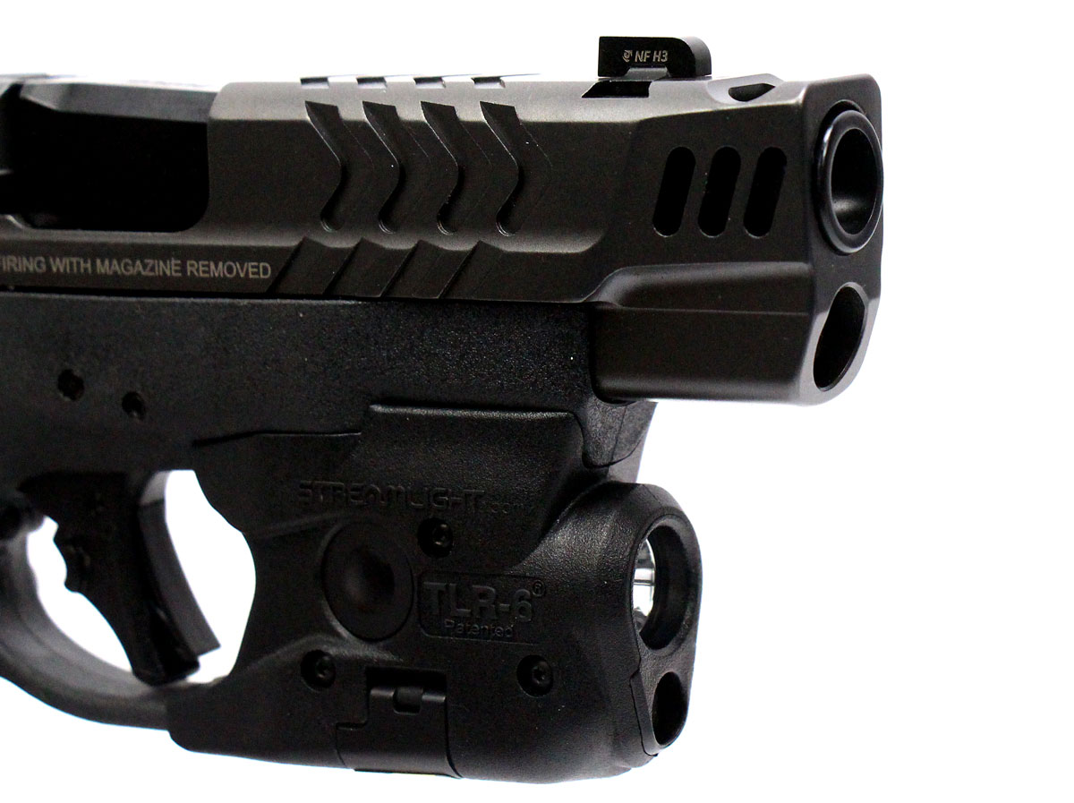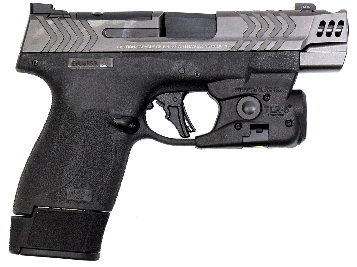 This is a used Smith & Wesson M&P 9 Shield Plus Carry Comp Performance Center pistol chambered in 9mm. It features a 4-inch ported barrel, 15-round magazine, tritium front sight, optics ready slide, Streamlight TLR-6 light with red laser, and flat face trigger. Includes factory box, manual, one 15-round magazine, and one 10-round magazine. Overall, this Smith is in good condition with normal wear on the slide and barrel. This would be a good choice for concealed carry. Buy online today!