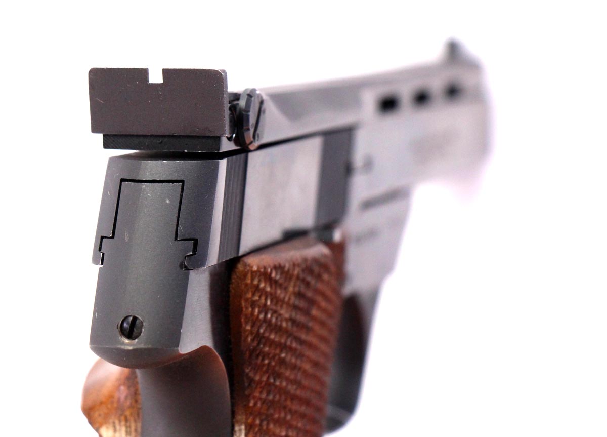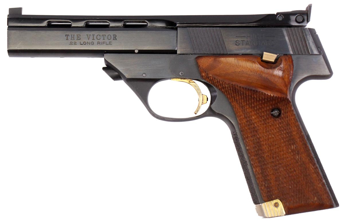 This is a used High-Standard Victor pistol chambered in 22 Long Rifle. It features a 4.5-inch barrel, 10-round magazine, thumb safety, adjustable rear sight, right-handed target grips, and blued finish. Overall, this pistol is in good condition with normal use wear on the slide. This would be a good choice for target shooting. Buy online today!