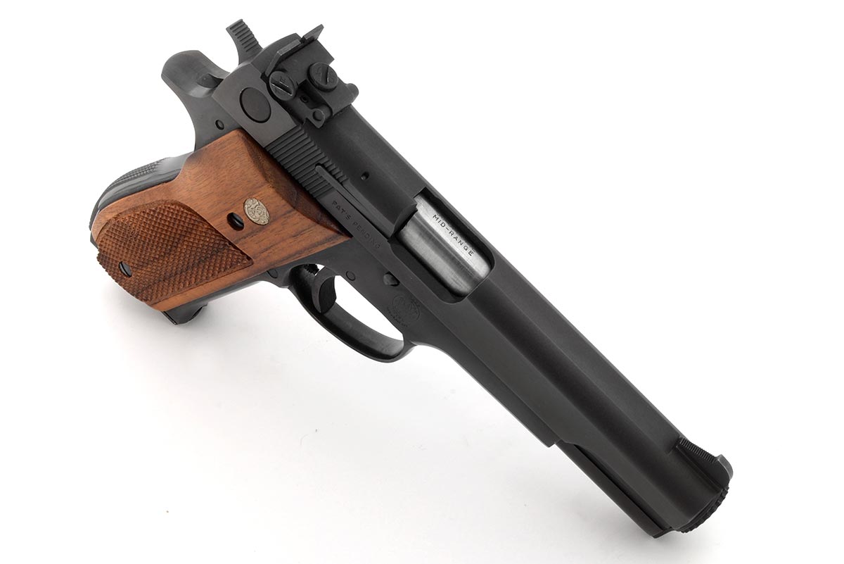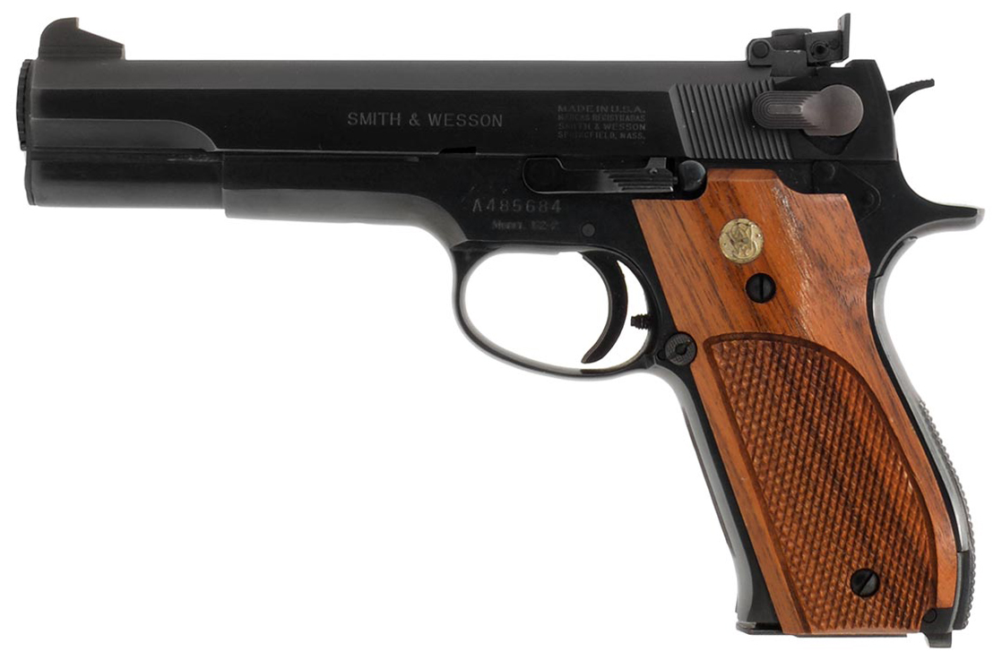This is a Smith & Wesson Model 52-2 38 Master pistol chambered in 38 Special Mid-Range. It features a 5-inch barrel, high gloss blued finish, wood grips, and 5-round magazine. The serial number indicates this pistol was manufactured in 1978. Smith & Wesson Model introduced the Model 52 as a match grade target pistol derived from the Model 39. The pistol was specifically designed to chambered for the 38 Special Mid-Range wadcutter for Bullseye shooting. Overall condition is exceptional with an excellent bore and no wear to the bluing. Included is the original box, takedown tool, and factory paperwork. This would make a great addition to a Smith & Wesson handgun collection. Buy online today!